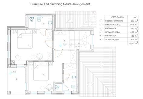Na prvom katu, površine 53,93 m², nalaze se dvije prostrane spavaće sobe, svaka s vlastitom kupaonicom. Ove sobe dijele zajedničku terasu, savršeno mjesto za jutarnju kavu ili večernje opuštanje uz pogled na okolni krajolik.
