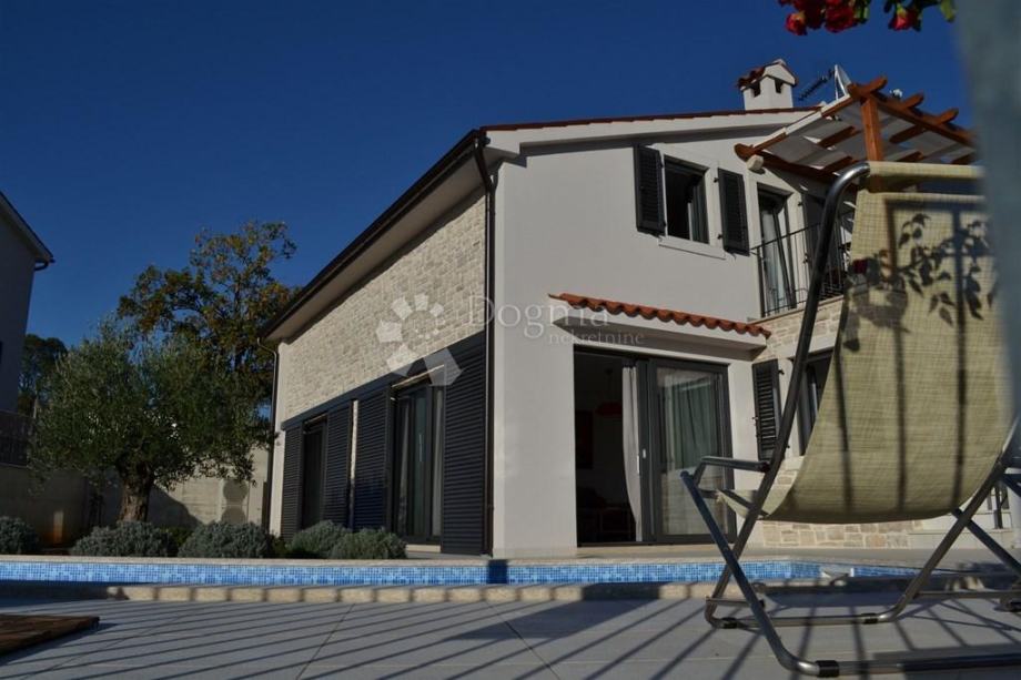 Prodajemo prekrasnu vilu na oko petnaest kilometara istočno od Poreča, u blizini Tinjana - poznatog istarskog grada pršuta. Kuća je sagrađena 2015. godine, ukupna površina zemljišta je 617 m2, od toga je oko 500m2 ograđenog vrta te je 24 m2 zauzeo bazen.