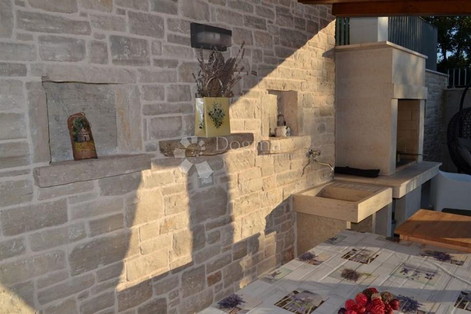 Okućnica je vrlo lijepo uređena, uz bazen je popločani dio dvorišta s roštiljem, vanjskim sjedalom i blagovaonom, uz bazen je i tuš na otvorenom. Kuća raspolaže svojim parkingom.