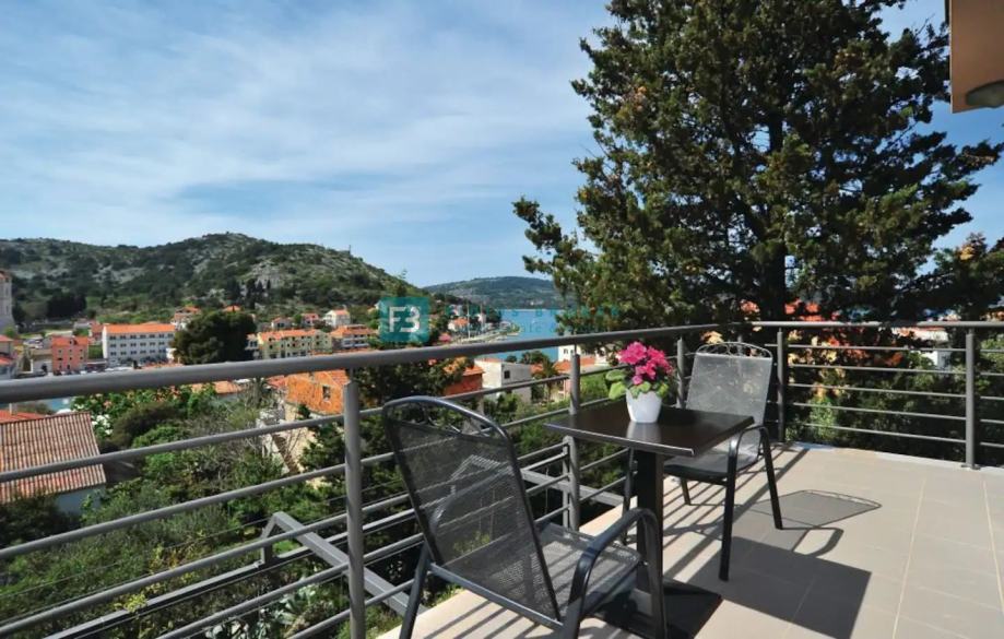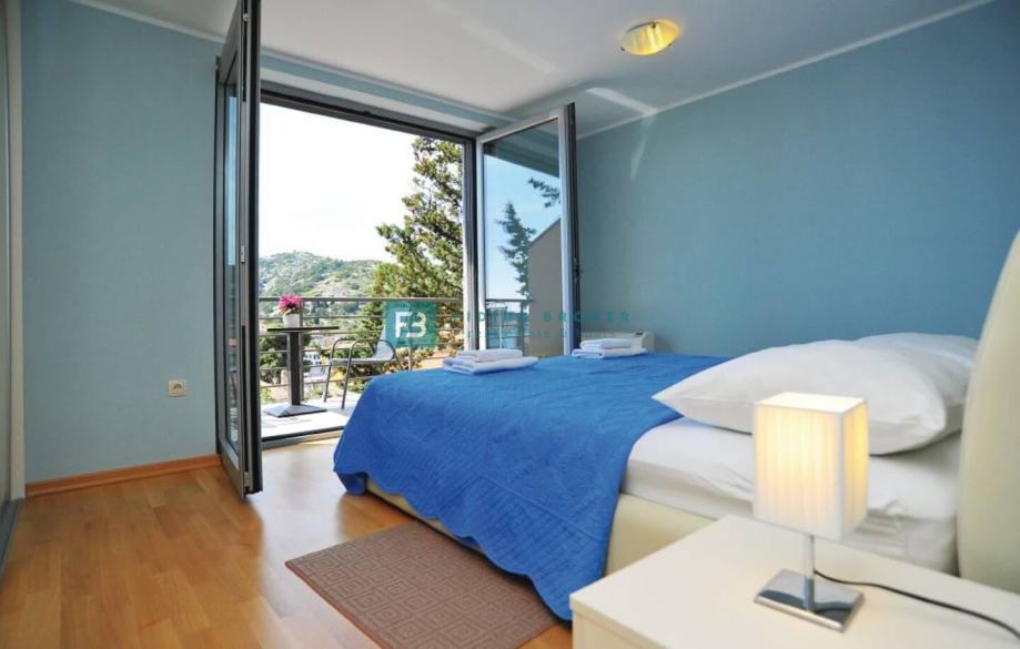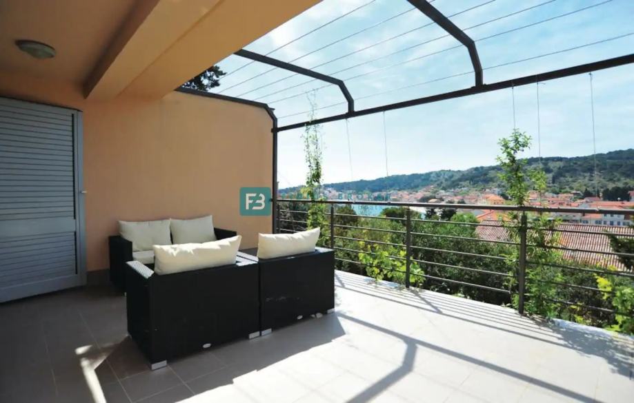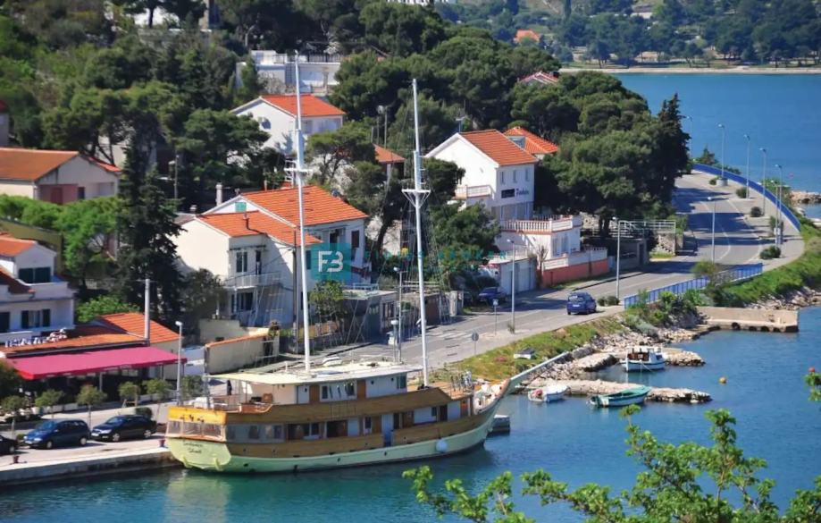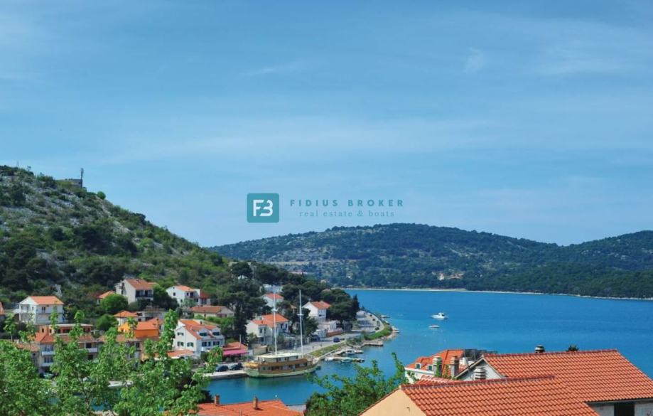 Dvojna kuća s dvorištem i pomoćnim objektom, kompletno uređena i namještena te odmah useljiva. Dvojna kuća se sastoji od prizemlje + kat. Sagrađena je 2011. godine (stiropor fasada, ALU stolarija s komarnicima). U pomoćnom objektu površine 34 m2 nalazi se studio apartman koji se sastoji od kuhinje, kupaonice i dnevnog boravka, korisne površine 34 m2. Preko dvorišta dolazimo do dvojne kuće ukupne površine 93 m koja se sastoji od prizemlja i kata. U prizemlju se nalazi apartman na dvije etaže s kuhinjom, kupaonicom i dnevnim boravkom koji ima izlaz na prostranu terasu s koje se pruža pogled na more. Vanjsko stubište vodi na katu kuće u kojem su smještene dvije spavaće sobe, od koje jedna ima izlaz na terasu koja ima jedinstven pogled na more i Tisno, te kupaonice. U dvorištu površine 89 m2 se nalazi roštilj i spremište. Kuća posjeduje dva parking mjesta.
