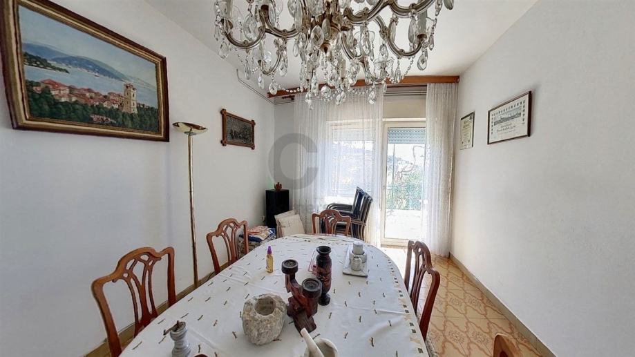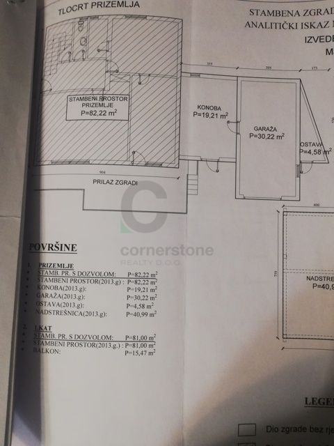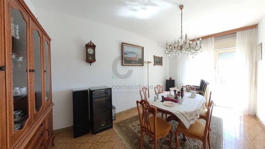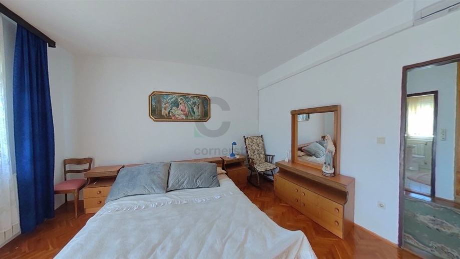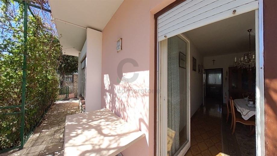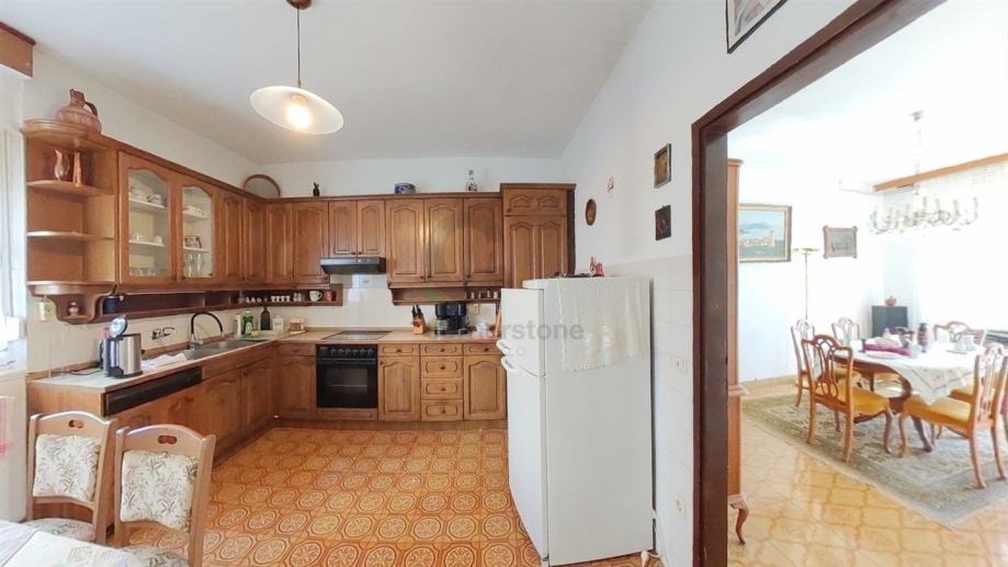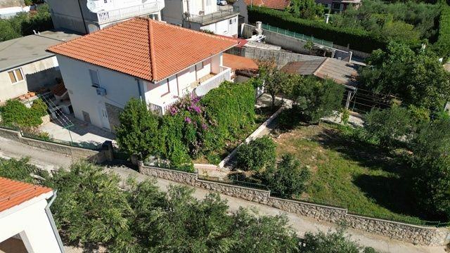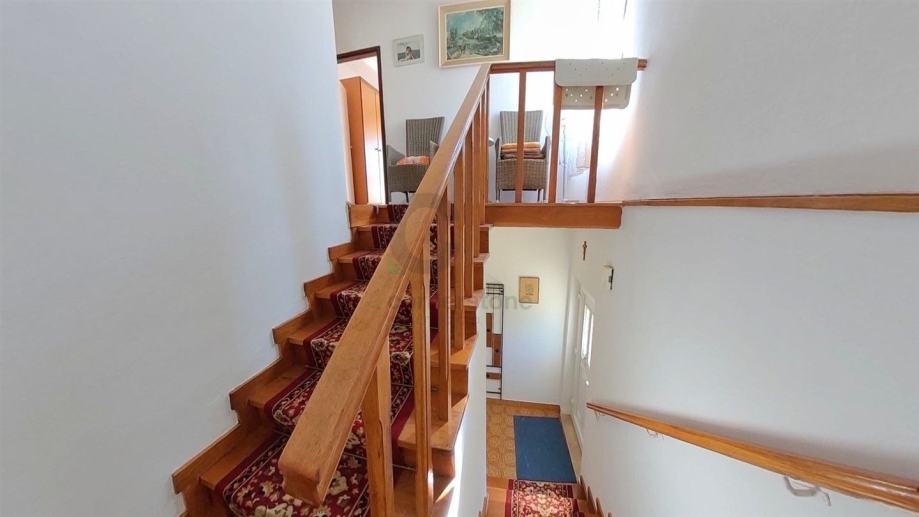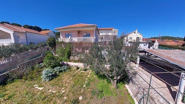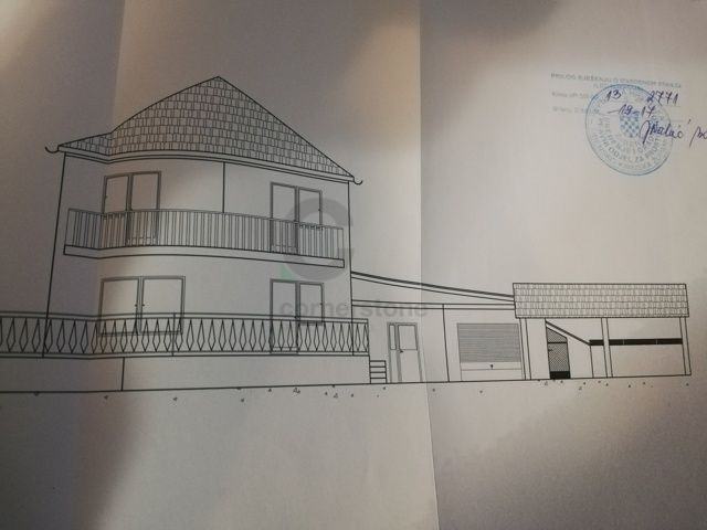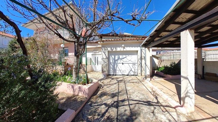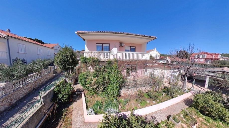 Samostojeća katnica, prizemlje+kat, obiteljska kuća. U prizemlju se nalazi hodnik, toalet s prostorom za tuš, mala ostava, dnevni boravak, kuhinja s ostavom, komunikacija s blagovaonicom i izlazom na terasu, veličine 84,52 m2. Stepenište za kat na kojem se nalazi kupaonica s toaletom, 3 spavaće sobe i terasa s prekrasnim pogledom na more, veličine 81m2. Krovište ima 96,47 m2, pa je to ukupno 262m2. Uz kuću se nalazi ljetna kuhinja i garaža, a uz garažu je ostava za vrtni alat, dok je u produžetku nadstrešnica. Parcela ima 609 m2, a kuća i pomoćna građevina imaju tlocrtnu površinu cca 255 m2, dok kompletna građevina ima 380m2 ukupno zatvorene i otvorene prostorije.