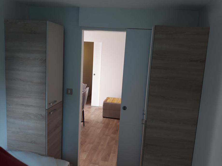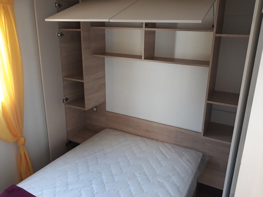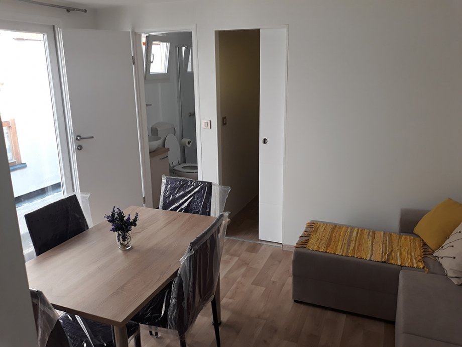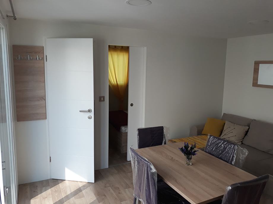 Dnevni boravak - stol i stolice za sjedenje, kutna garnitura na razvlačenje, niski ormarić za televizor, televizor 32 incha- lcd, vješalica za odjeću, klima