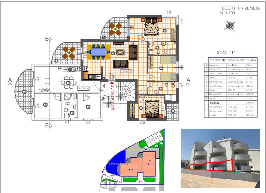 Ovaj prostrani apartman prostire se na 119,77 m2 u prizemlju. Sastoji se od dvije kupaonice, tri udobne spavaće sobe te open space prostora koji objedinjuje kuhinju, dnevni boravak i blagovaonicu. Uživajte u svakom trenutku na tri natkrivene terase koje pružaju spektakularan pogled na more i okolni krajolik. Ovdje možete provoditi ugodne trenutke s obitelji i prijateljima, opuštajući se uz zvuk valova i svjež morski zrak.