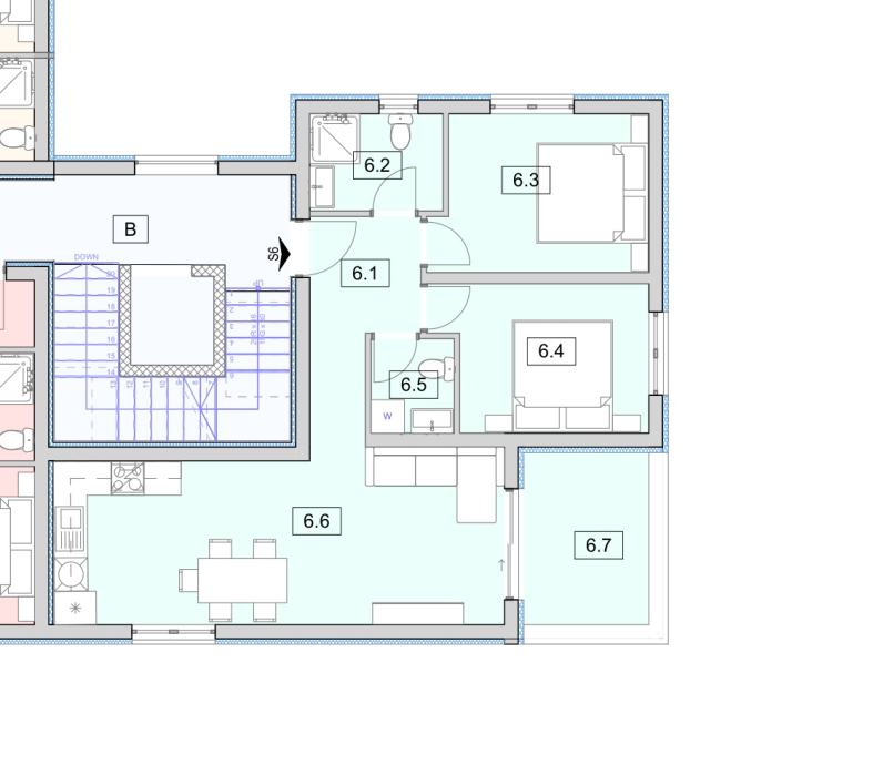 Stan S6 I.kat - ukupne korisne površine 64,61 m2 (stambena površina 58,12 m2 + terasa 6,97 m2 + parking) nalazi se na 1. katu. Sastoji se od hodnika, predsoblja, kupaonice, WC-a, dvije spavaće sobe, kuhinje s blagovaonicom, dnevnog boravka s izlazom na lijepu natkrivenu terasu površine 6,97 m2 s koje se pruža lijepi pogled na more. Stanu pripada 1 parkirno mjesto - 258.440,00 eur