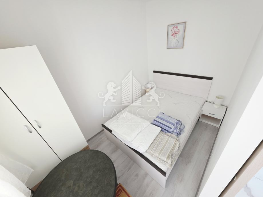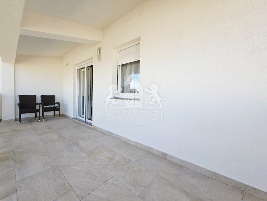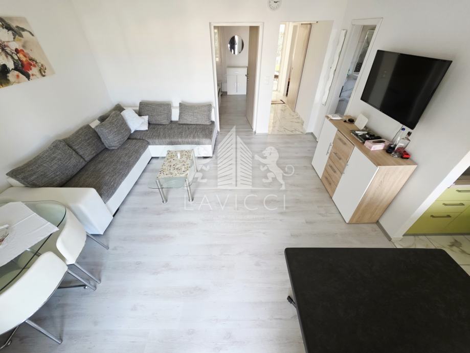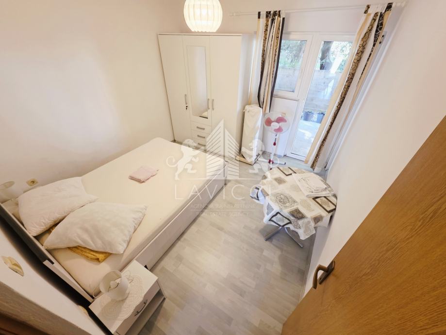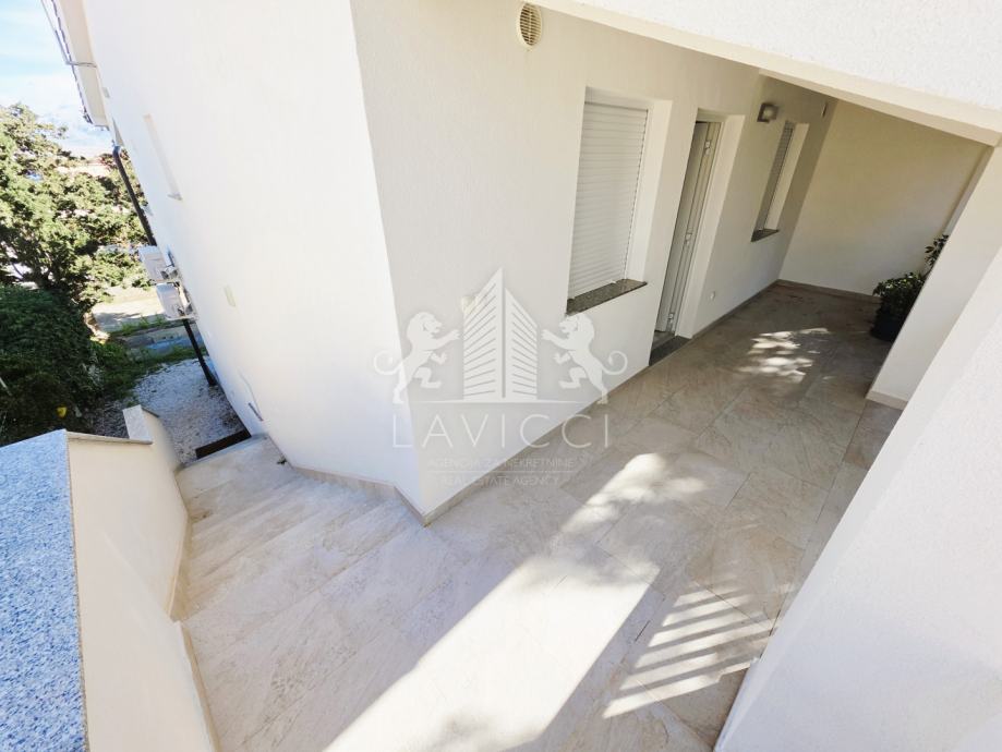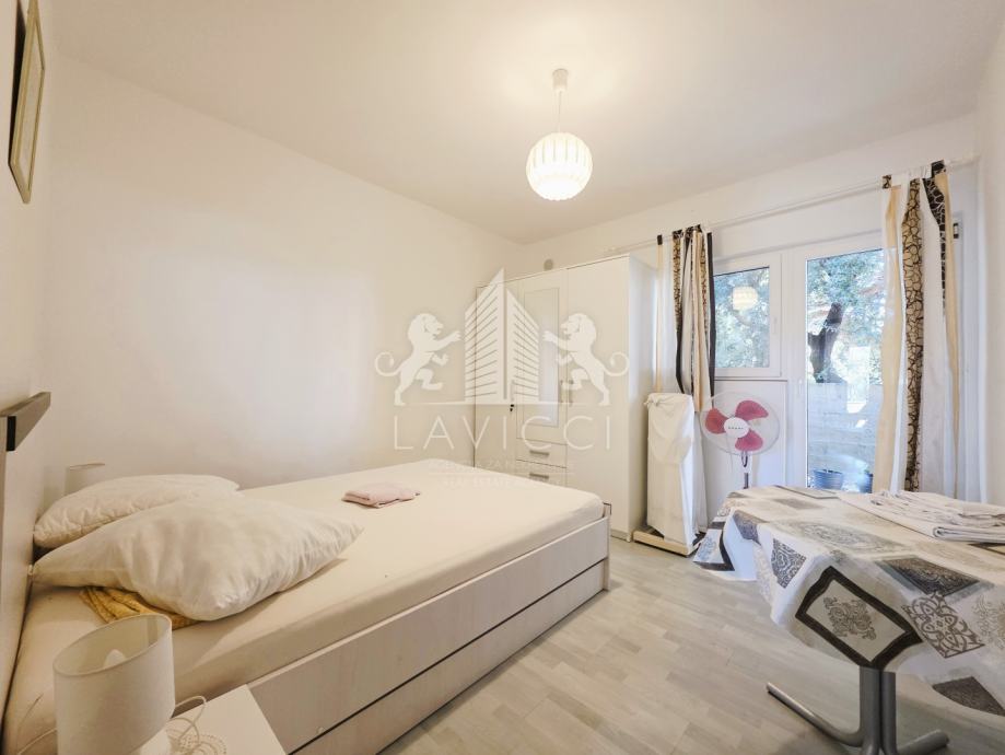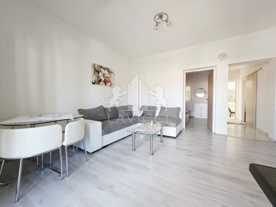 U prizemlju se nalazi apartman s natkrivenom terasom, dnevnim dijelom koji uključuje kuhinju s blagovaonicom i dnevni boravak, kupaonicom s WC-om te dvije spavaće sobe s izlazom na drugu natkrivenu terasu.