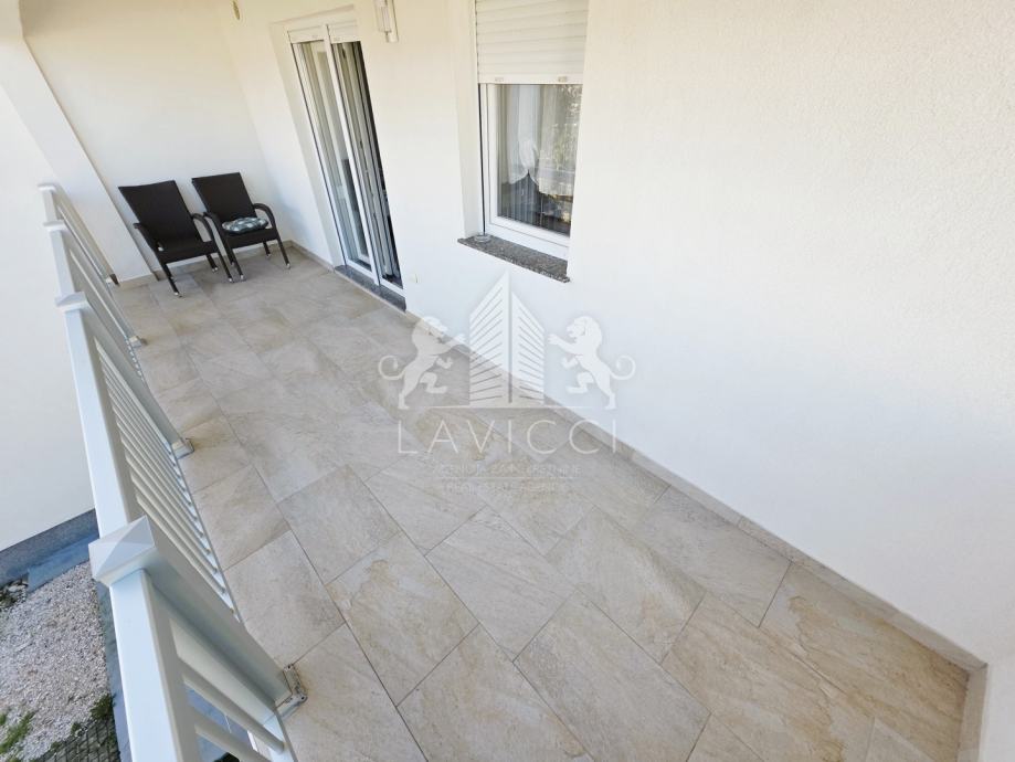 Vanjsko stubište vodi na kat, gdje se nalazi drugi apartman s natkrivenom terasom, ulaznim hodnikom, dvije spavaće sobe te kuhinjom s blagovaonicom i dnevnim boravkom. Iz dnevnog boravka izlazi se na natkriveni balkon s kojeg se pruža pogled na more. Ispod stubišta nalazi se ostava u kojoj je smješten hidropak za bušotinu s vodom.