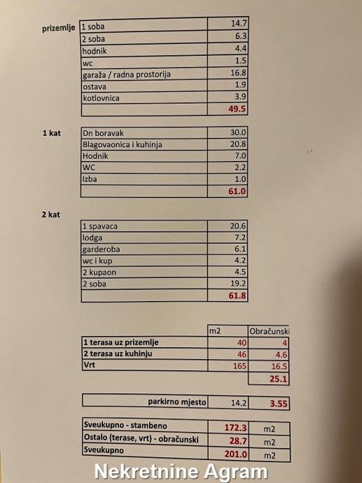 Izuzetno kvalitetna gradnja(armirano betonska konstrukcija) te novoadaptirana dvojna stambena zgrada podijeljena i razvedena u tri etaže od čega na stambenu kvadraturu otpada 172 m2, plus terase od 40 i 46 m2 te vrt od 165 m2 i parkirno mjesto .Zgrada je od svega dva stana.