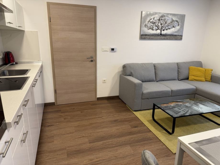 Stan se nalazi u visokom prizemlju (zapravo 1. kat). Stan se sastoji od ulaznog hodnika, kupaonice sa tuš kadom 80x100cm, odvojenom spavaćom sobom sa boxspring krevetom 160x200cm, te jednom prostorijom u kojoj su dnevni boravak, blagovaonica i kuhinja.