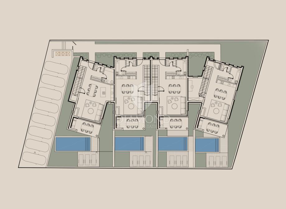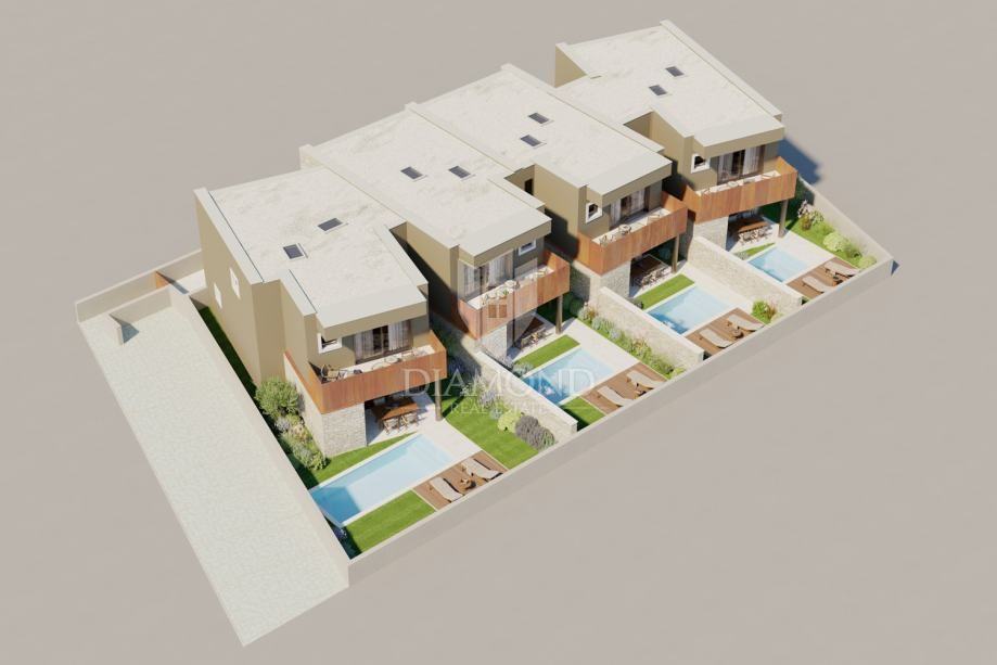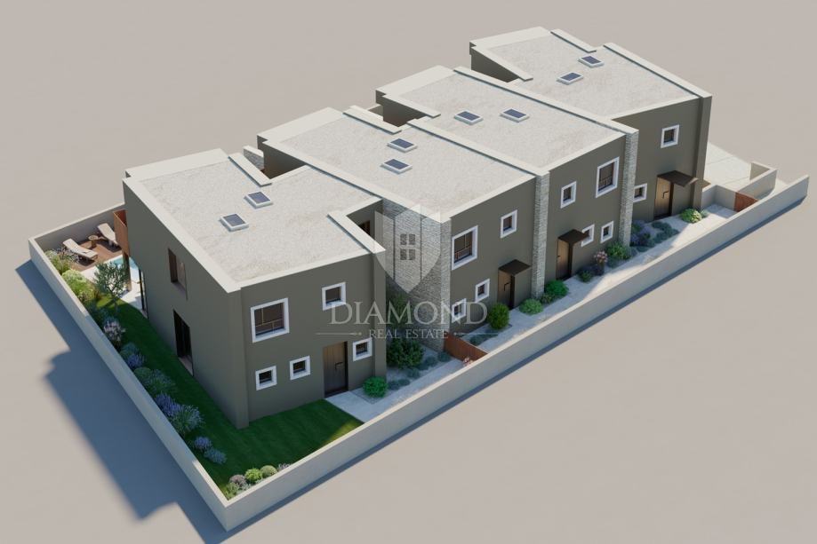 U mirnoj okolici Rovinja, svega pet kilometara od mora, nalazi se ova elegantna kuća u nizu koja spaja šarm tradicionalne istarske arhitekture i udobnost modernog života. S posebnom pažnjom birani materijali – suhozid od istarskog kamena, tople corten plohe i vrhunska aluminijska stolarija WICONA – daju joj prepoznatljiv karakter i trajnu vrijednost. Na 140 m² stambene površine raspoređene na dvije etaže nalazi se prostrana living zona otvorenog tipa s dnevnim boravkom, blagovaonicom i kuhinjom, tehničkom sobom, garderobom i WC-om, dok iz dnevnog prostora velika staklena stijena vodi na okućnicu od 65 m². Tamo vas očekuje natkrivena terasa s ljetnom kuhinjom, sunčalište i bazen s elektrolizom soli i pripremom za grijanje – savršeno za duga opuštanja i druženja. Na katu su dvije prostrane master spavaće sobe, svaka s vlastitom kupaonicom i garderobom, te treća soba koju možete pretvoriti u spavaonicu, radnu sobu ili privatni wellness sa saunom. Kuća je vrhunski opremljena: energetski razred će biti A, podno grijanje u svim prostorijama i klima uređaji DAIKIN, priprema za solarnu elektranu, premium sanitarije CATALANO, HANS GROHE i TECE, krovni prozori Velux sa solarnim roletama, talijanska keramika i hrastov parket, videonadzor, alarm i videoportafon. Na raspolaganju su i dva parkirna mjesta s pripremom za punjače električnih vozila. Ova kuća pruža luksuz, udobnost i mir – sve na dohvat najljepših plaža i šarmantnog Rovinja. Ako tražite dom ili investiciju koja kombinira vrhunsku kvalitetu, predivan dizajn i savršenu lokaciju, ovo je prilika koju ne biste smjeli propustiti.