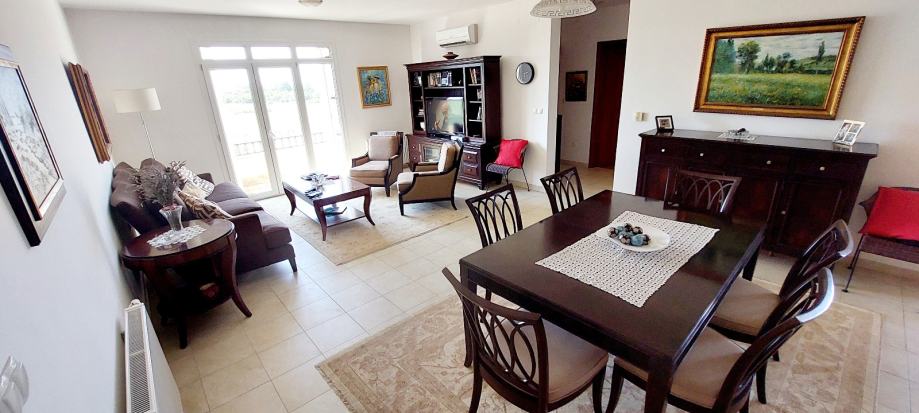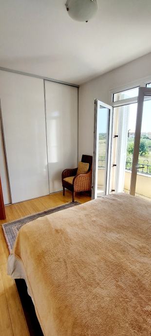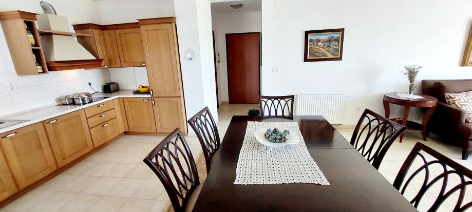 Stan je pažljivo uređen i opremljen namještajem izrađenim od punog drveta, što prostoru daje osjećaj kvalitete i bezvremenske vrijednosti. Posebnu udobnost pružaju dvije prostrane spavaće sobe, svaka s ugradbenim ormarima i direktnim izlazom na terasu – savršeno za jutarnju kavu ili opuštanje na večernjem zraku. Dnevni boravak je prozračan i ugodan, povezan s blagovaonicom i kuhinjom, što ga čini idealnim za svakodnevni obiteljski život, ali i za primanje gostiju.