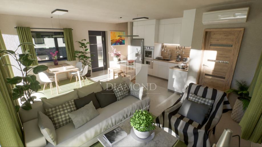 Stan se proteže na dvije etaže i odlikuje se pažljivo osmišljenim rasporedom. U prizemlju se nalazi prostrani dnevni boravak povezan s blagovaonicom i kuhinjom u otvorenom konceptu, iz kojeg se izlazi na natkrivenu terasu i privatni vrt površine 165 m². Vrt pruža mogućnost izgradnje bazena ili dodatnih sadržaja za uživanje na otvorenom. Na istoj etaži smješteni su i kupaonica te ostava, što dodatno povećava funkcionalnost prostora.