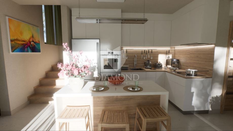 U mirnom i atraktivnom naselju na rubu Poreča, svega jedan kilometar od mora i dva kilometra od centra grada, smještena je moderna novogradnja u obliku dvoetažnog stana – town house koncepta koji spaja udobnost obiteljskog doma s privatnošću i funkcionalnošću.