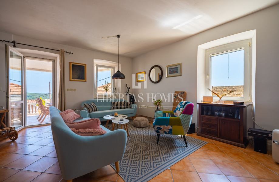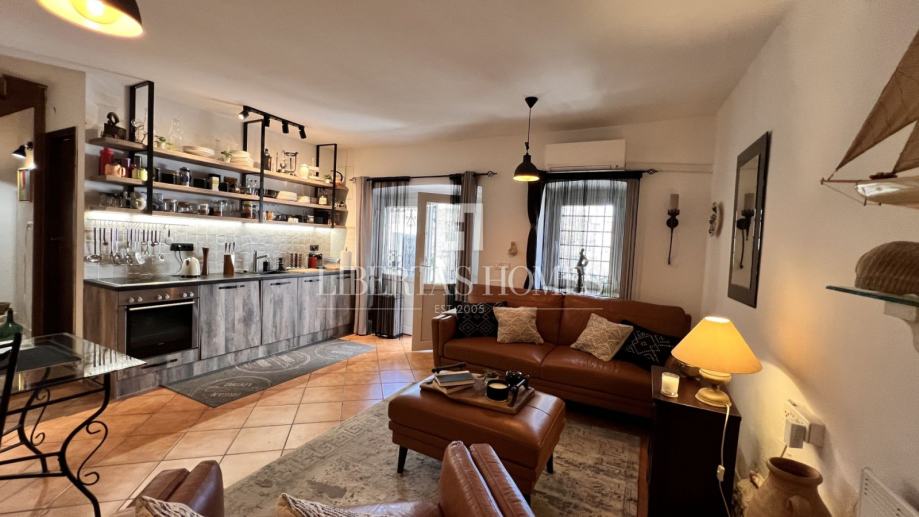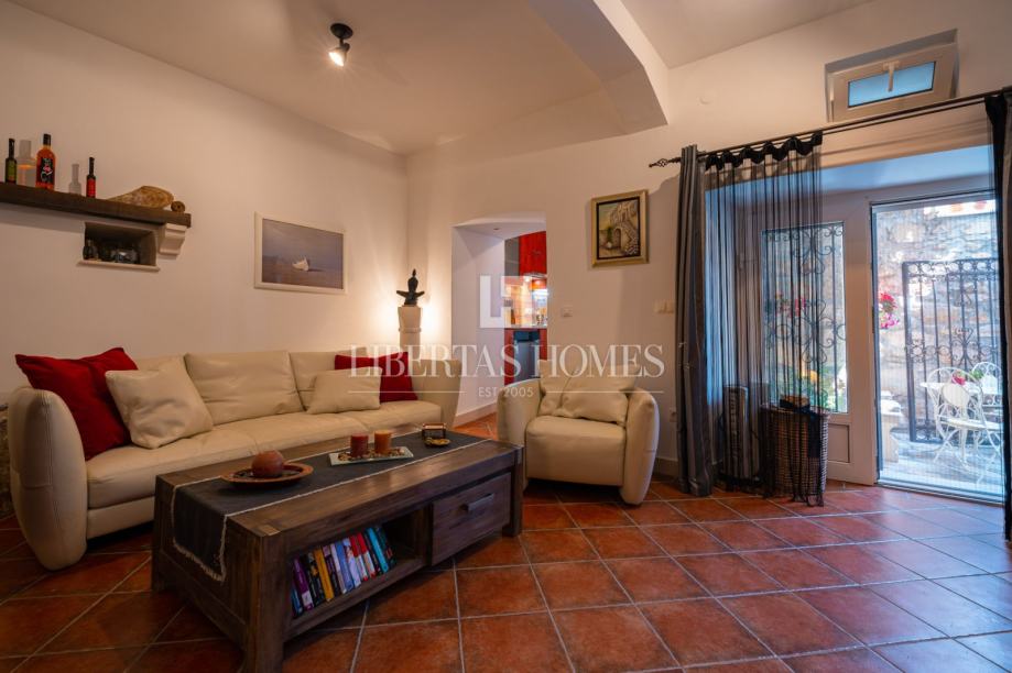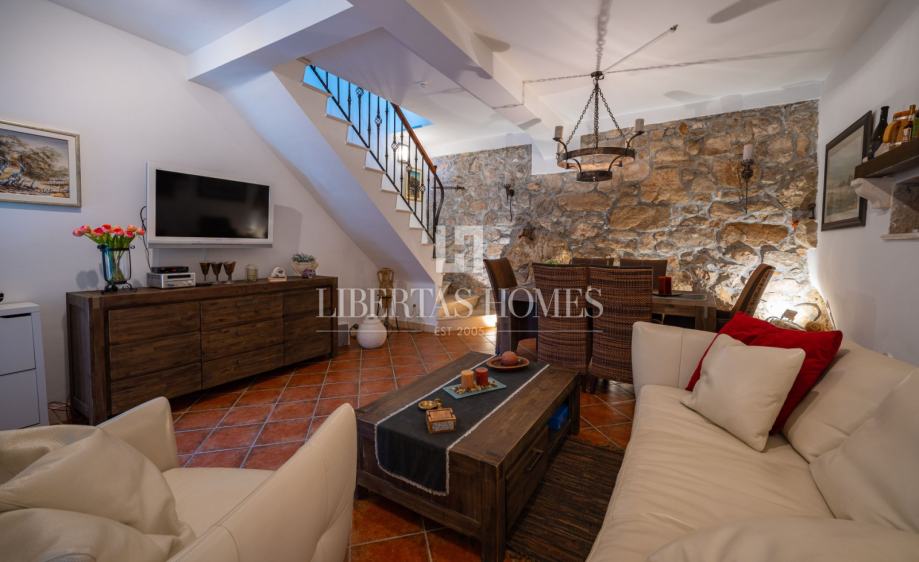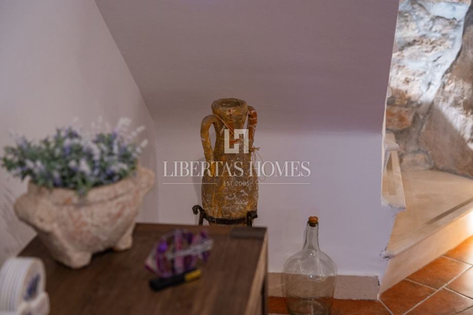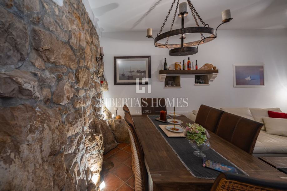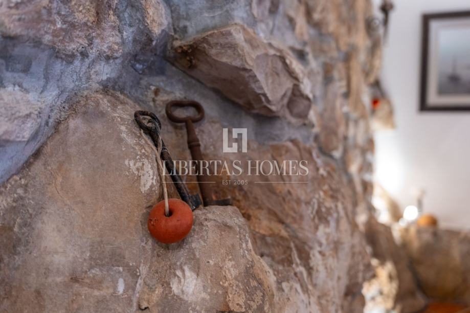Unutrašnjost kuće odiše autentičnim mediteranskim šarmom. Pri uređenju je poseban naglasak stavljen na prirodne materijale, osobito kamen, koji se kao središnji dekorativni element savršeno uklapa u prostor i stvara toplu, tradicionalnu atmosferu.