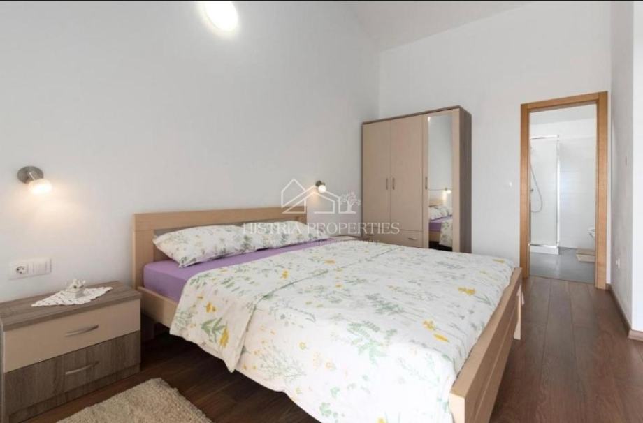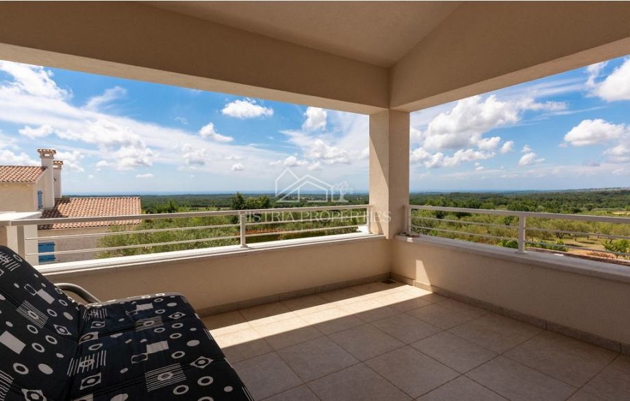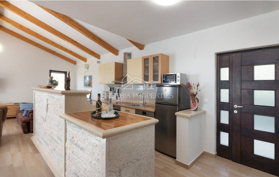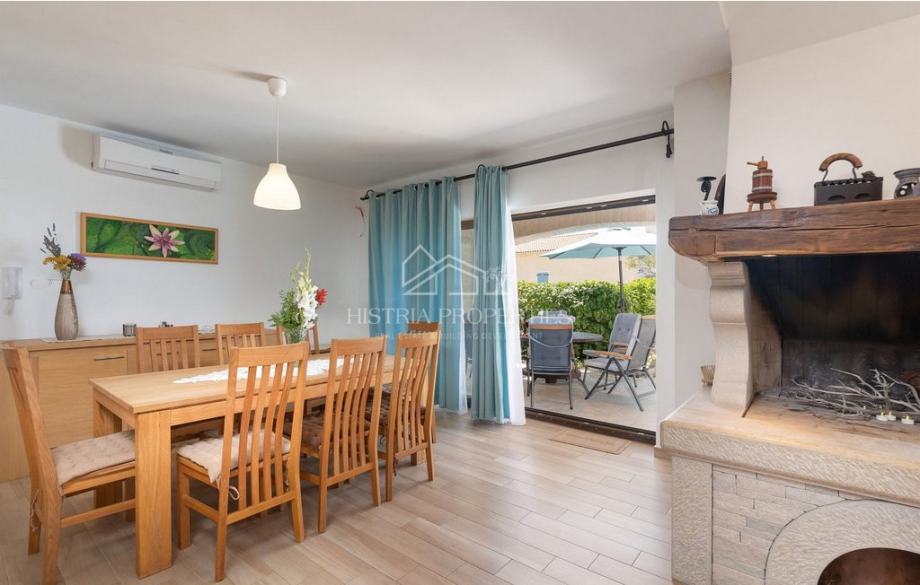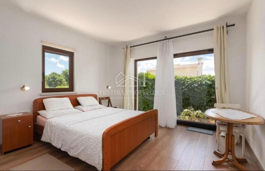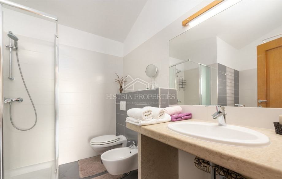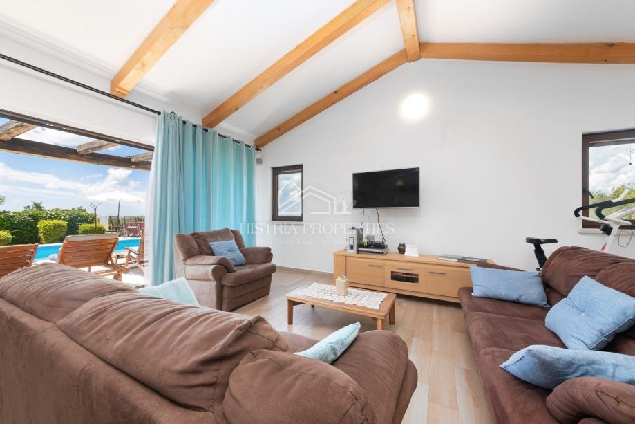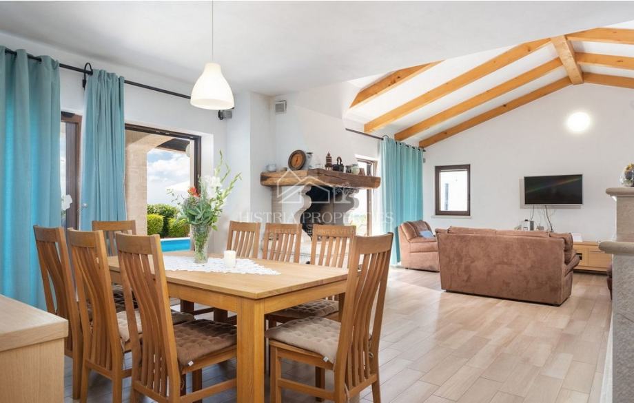 U prizemlju se nalazi dnevni boravak s blagovaonom i kuhinjom, spavaća soba s vlastitom kupaonom, dodatni toalet i vešeraj. Na prvom katu se nalaze 2 spavaće sobe sa vlastitim kupaonama i terasom. Sa obje terase se pruža prekrasan panoramski pogled na istarski krajolik i more.
