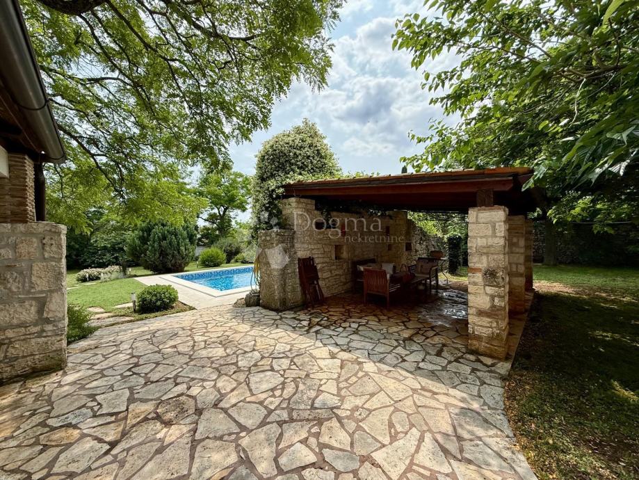 U dvorištu se nalaze dvije natkrivene terase, idealne za ljetne večere, obiteljska okupljanja ili jednostavno tihe trenutke uz knjigu i čašu vina. Jedna terasa krije i veliki kameni kamin – dodatni poziv na boravak vani tijekom cijele godine. Pred ulazom u kuću smještena je još jedna manja terasa, kao stvorena za jutarnju kavu dok se svijet polako budi.