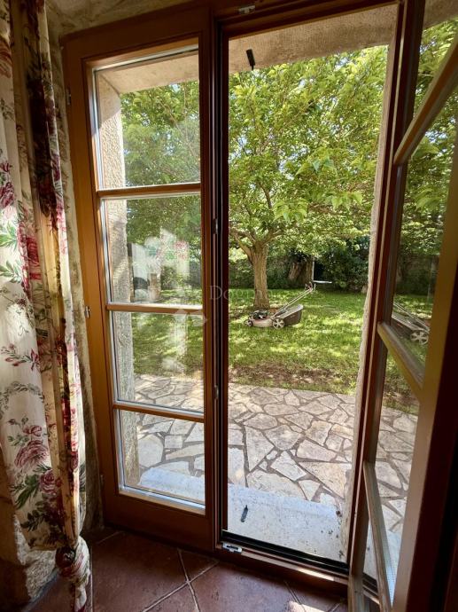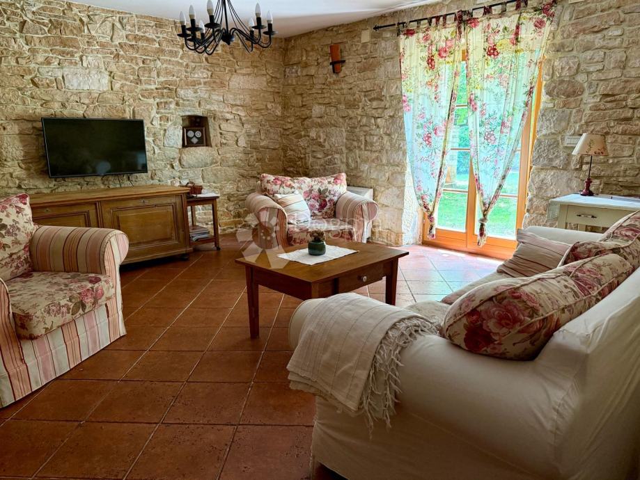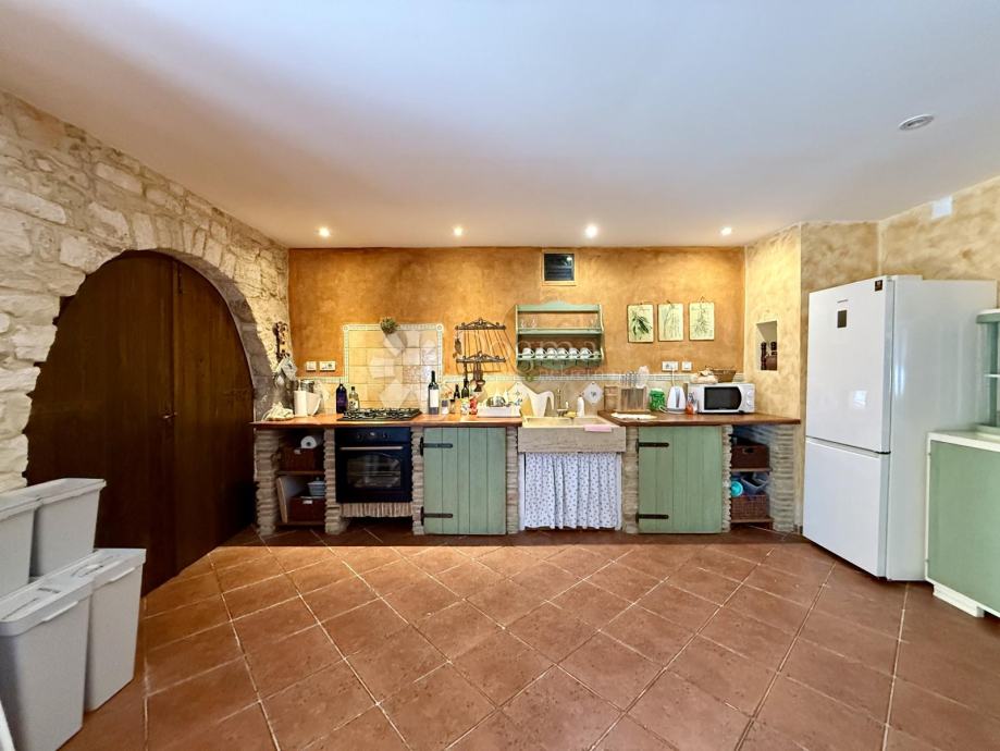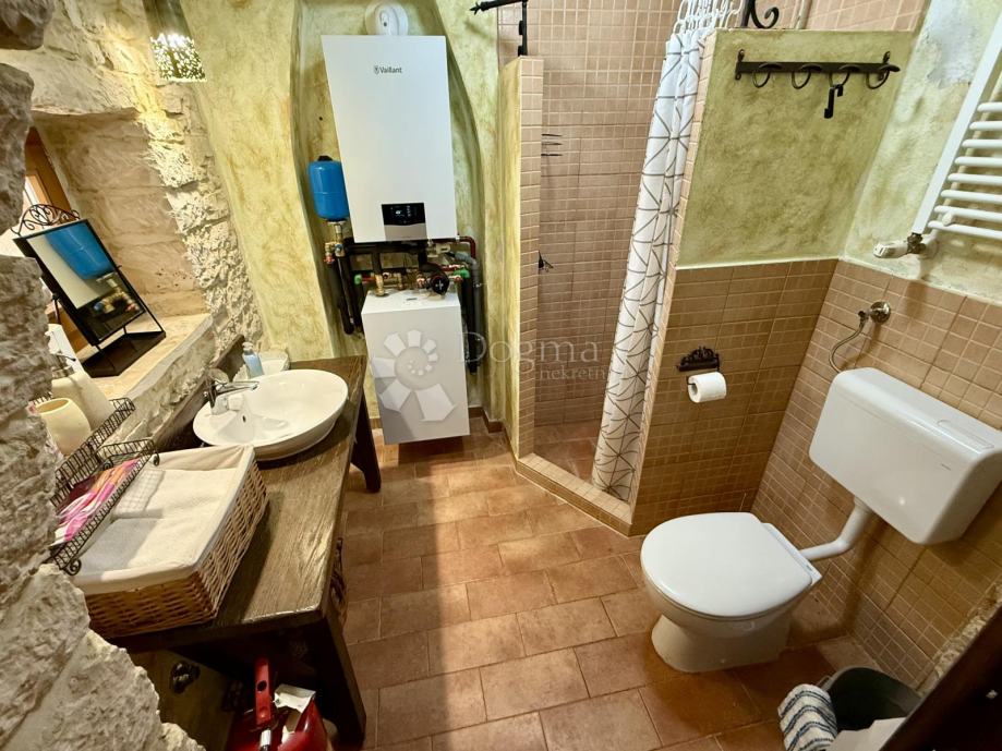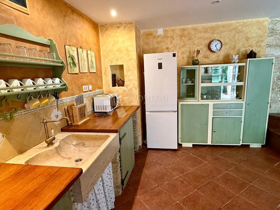Kuća je građena od pravog istarskog kamena, izvana i iznutra pažljivo fugiranim, s kvalitetnom drvenom stolarijom od ariša koja se savršeno uklapa u tradicionalni štih doma. Ulaskom u kuću osjećate toplinu – ne samo zbog debelih kamenih zidova koji čuvaju ugodnu temperaturu, već i zbog pomno biranih detalja interijera koji odišu jednostavnošću i elegancijom. Ovo nije kuća uređena za katalog, već mjesto koje vas poziva da u njemu živite.