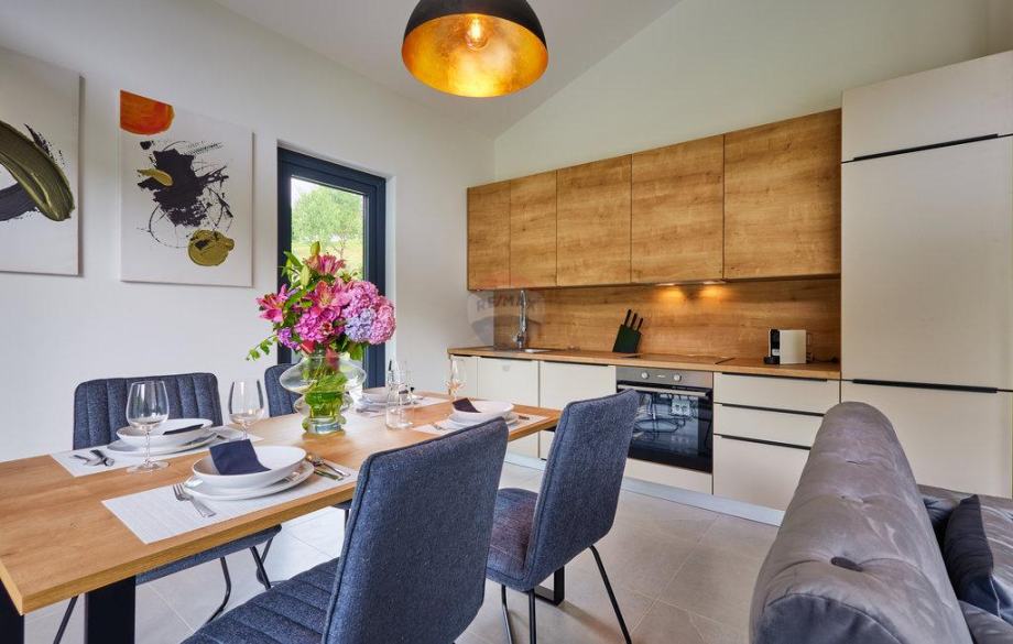 Sastoje se od 2 spavaće sobe, "open space" dnevnog boravka sa velikom staklenom stijenom spojenog sa kuhinjom i blagovaonicom, kupaonice, toaleta, saune,