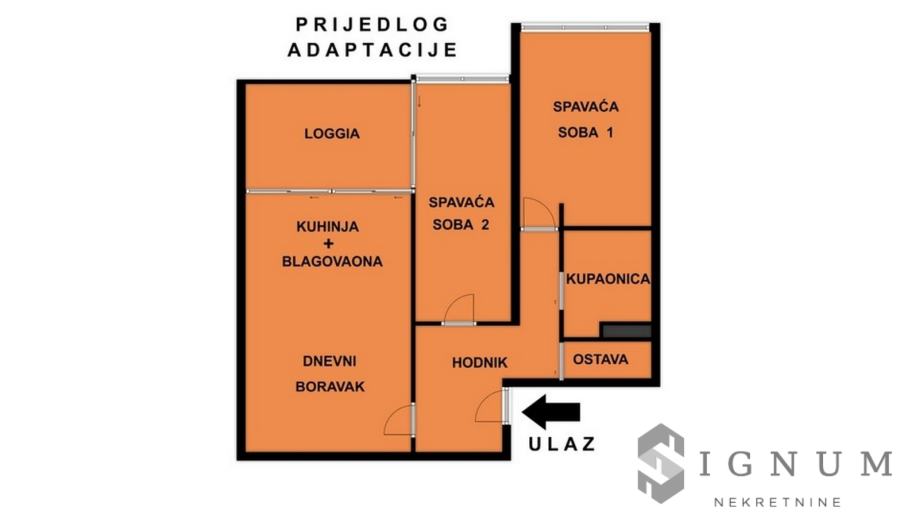 Stan je moguće uz minimalnu investiciju preurediti u 3-soban stan, a prijedlog adaptacije se nalazi u tlocrtima oglasa.