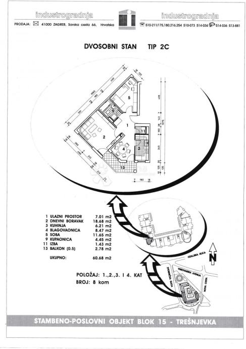 Stan je ukupne površine 60,68 m² te se sastoji od: ulaznog hodnika s ostavom (mogućnost walk-in ormara), spavaće sobe s pogledom na legendarni Trešnjevački plac, kupaonice s tuš kabinom, prostrane druge sobe / dnevnog boravka, zasebne kuhinje sa blagovaonicom. Iz kuhinje i dnevnog boravka izlazi se na svijetlu, svakodnevno osunčanu lođu jugoistočne orijentacije površine 5,56 m² (obračunski 2,78 m² NKP). Stanu pripada i spremište u potkrovlju površine 6,82 m².
