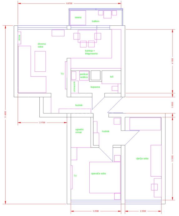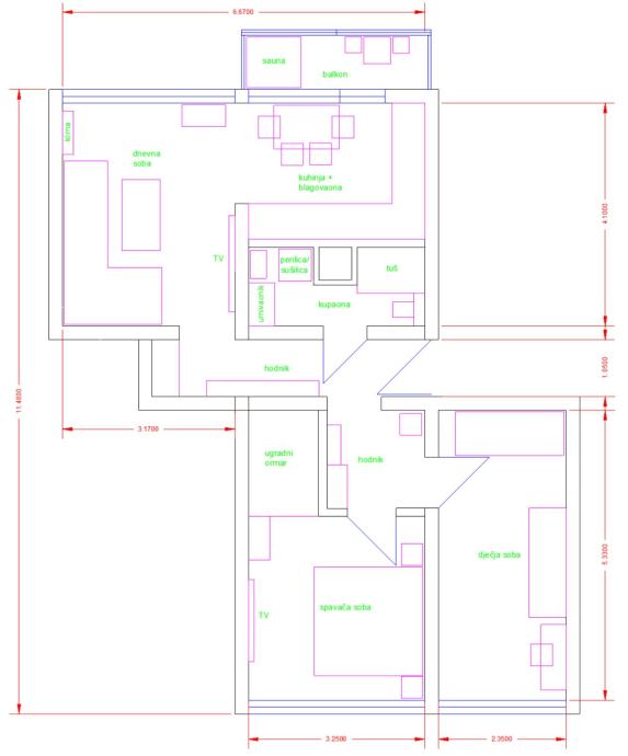 STAN: ulazni garderobni hodnik, dnevna soba s blagovaonicom i kuhinjom, predsoblje, spavaća soba s garderobom, dječja soba, kupaonica s tuš kabinom i toaletom, zatvoreni balkon sa saunom i garniturom za sjedenje. Stanu pripada i spremište u podrumu, a ispred zgrade je besplatni vanjski parking.