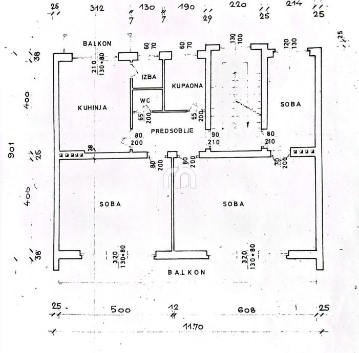 3 sobe ( jedna soba s tlocrta je pregrađena )
