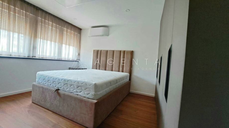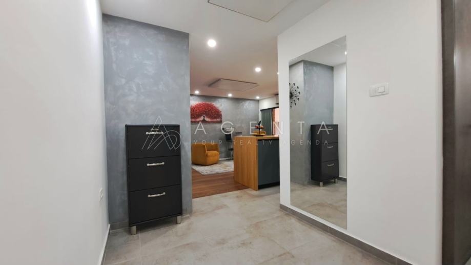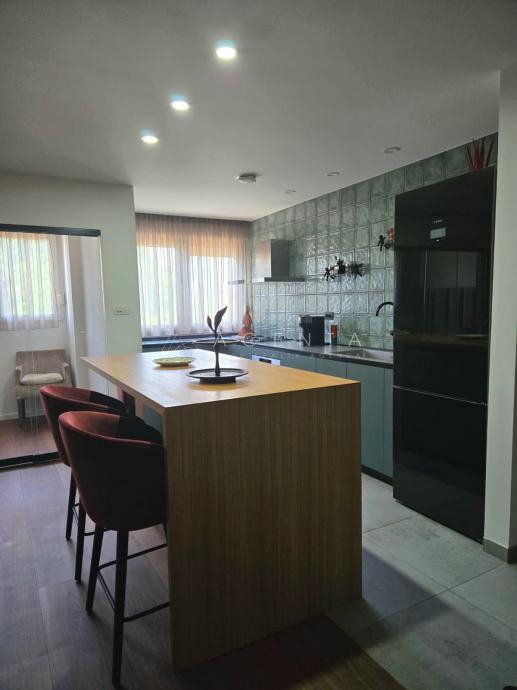 Stan je opremljen namještajem po mjeri, a kuhinja vrhunskim kućanskim aparatima BOSCH koji su pod garancijom. Kupaonica sadrži sanitarije KLUDI, GEBERIT ugradbeni vodokotlić i tuš s podom od lijevanog mramora. Podovi su dizajnerski kompozit od drveta, a prozori KÖMMERLING trostruko staklo s termo-roletama i komarnicima.