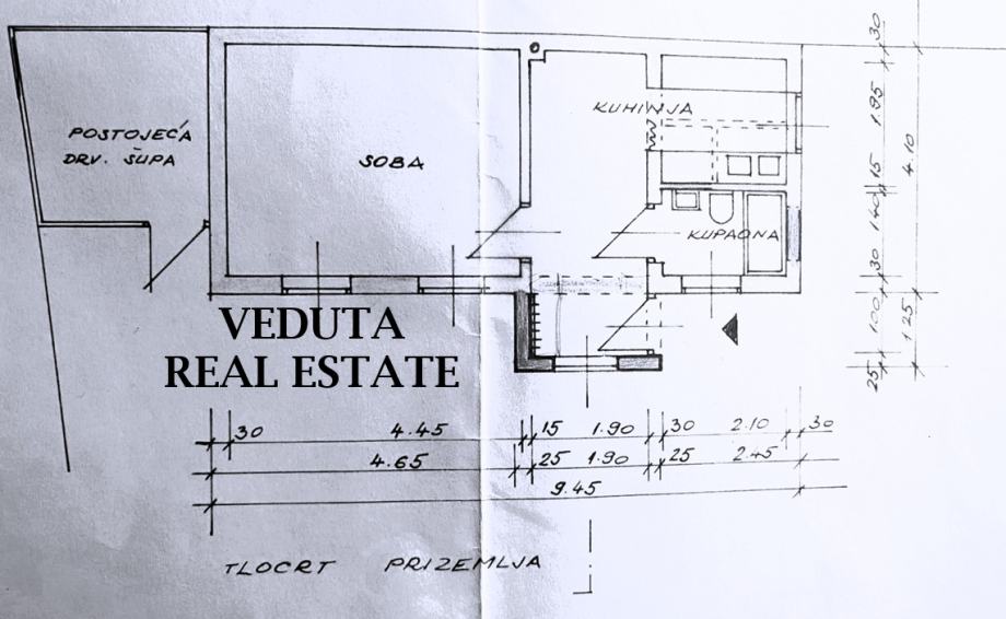 Zemljište ima 184 m2, kuća tlocrtno zauzima 49 m2.