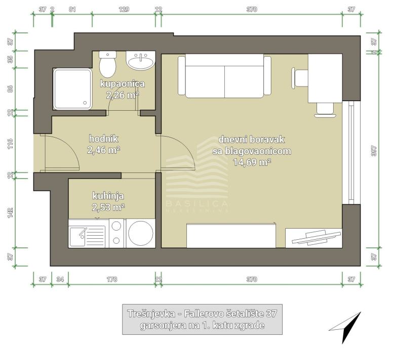 Stan se sastoji od: ulaznog hodnika, kuhinje, kupaonice i dnevnog boravka sa blagovaonicom. Balkona nema. Orijentacija; sjeveroistok (puno svjetla i topline).