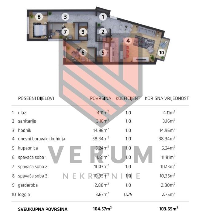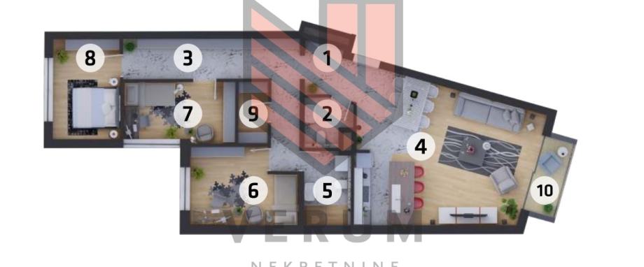 Četverosoban sastoji se od ulaznog hodnika, dnevnog boravka, kuhinje i blagavaone spojene u jedno sa izlazom na loggiu, tri spavaće sobe, kupaone, WC-a te garderobe. Obavezna kupnja parking mjesta