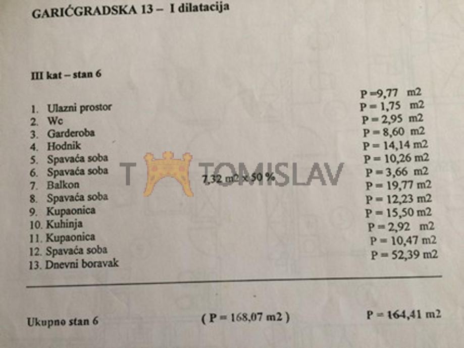 TREŠNJEVKA SJEVER -prodaje se ekskluzivni višesobni stan površine 180,2m2 površine 180,2 m2 ,NKP 191,36m2izgrađen 2000 g.,potpuno renoviran 2022 g. Stan se nalazii na IIIkatu stambene zgrade sa liftom i satoji se od ulaznog prostora,,4 spavaće sobe,kuhinje sa dnevnim boravkom ,garderobe,, 2 kupaonice sa WC-om plus dodotni WC,spremišta,balkona....Zgrada ima ulaz za invalideprostrane garaže,parking mjeseta,klimatiziran,video nadzora..Stan ima mogućnost 3 telefonske linije,kabelska tv.Novi kondenzacijski bojler,u kupaoni podno grijanje.Odličan raspored,nenamješten,pogodan za stanovanje i poslovni prostor.Blizina tramvaja,škole ,ambulante,vrtića, doma zdravlja,trgovina, tržnice.ENERGETSKI CERTIFIKAT-B,čisto vlasništvoi,uporabna dozvola