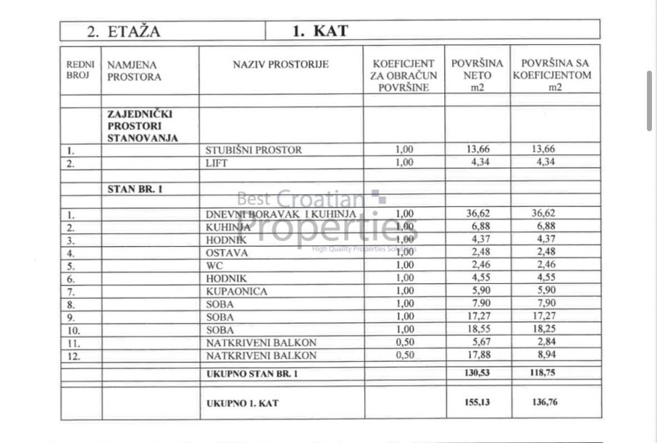 Sastoji se od hodnika (4.37m2), openspace dnevnog boravka (36.62m2), kuhinje (6,88m2), ostave (2,48m2), tri spavaće sobe (18,25m2, 17.25m2 i 7.90m2), kupaonice (5.90m2), dodatnog wc-a (2.46m2), hodnika 2 (4.55m2) te dva natkrivena balkona (17.88m2 i 5.67m2), što ukupno sa koeficijewntimaiznosti 118.75m2 stambene površine.