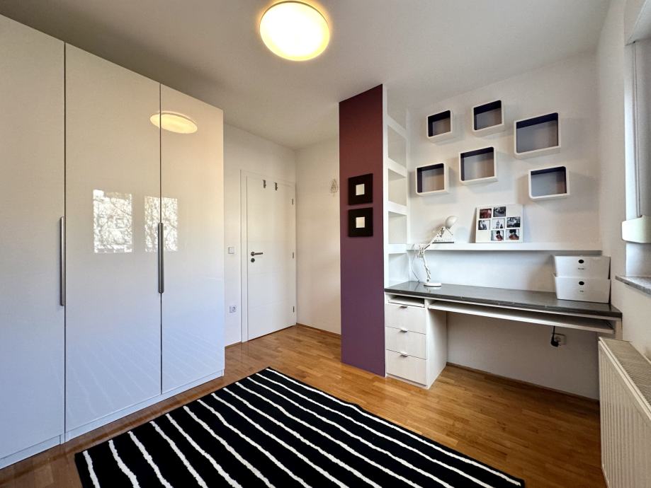 Stan se sastoji od hodnika, dnevnog boravka s kuhinjom, lođe, velike spavaće sobe, manje radne ili dječje sobe, kupaonice s WC-om i toaleta.