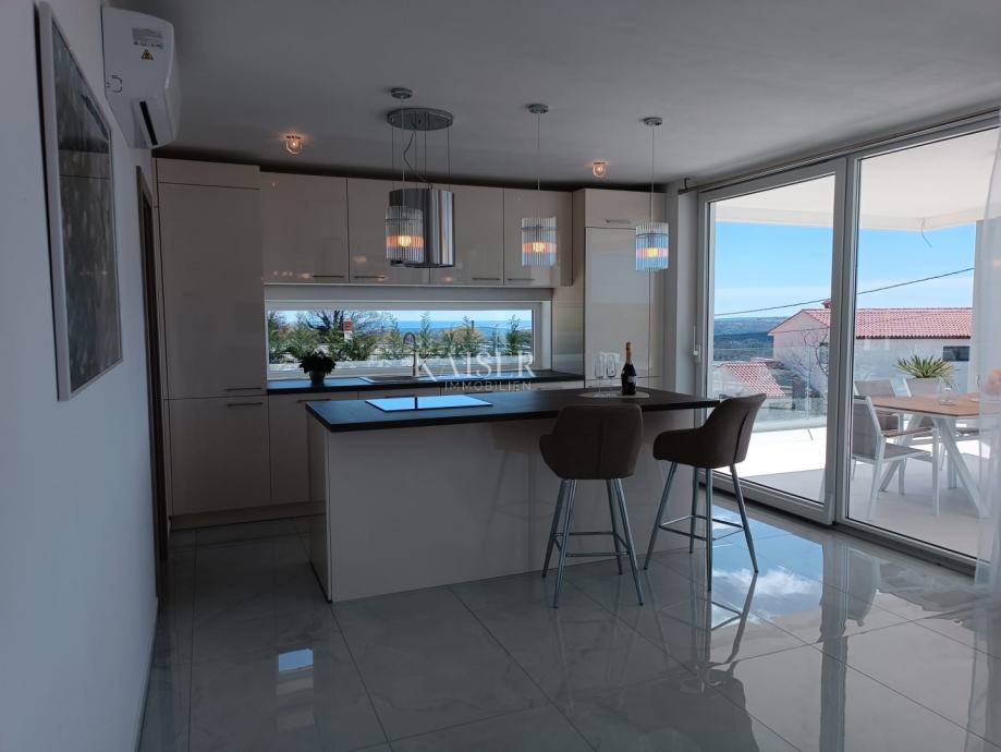 Moderna i u potpunosti opremljena kuhinja s blagovaonicom odijeljena je svega nekoliko koraka od prostranog bazena s terasom.