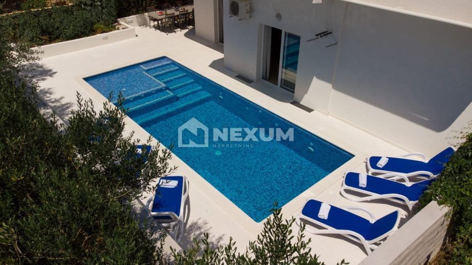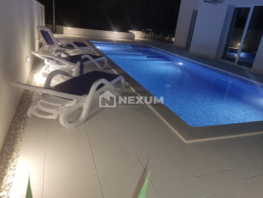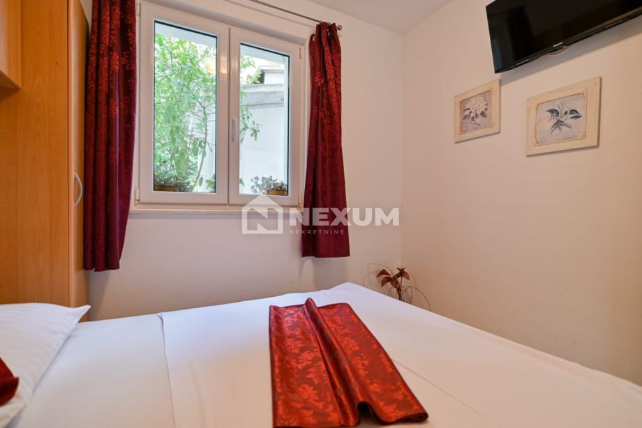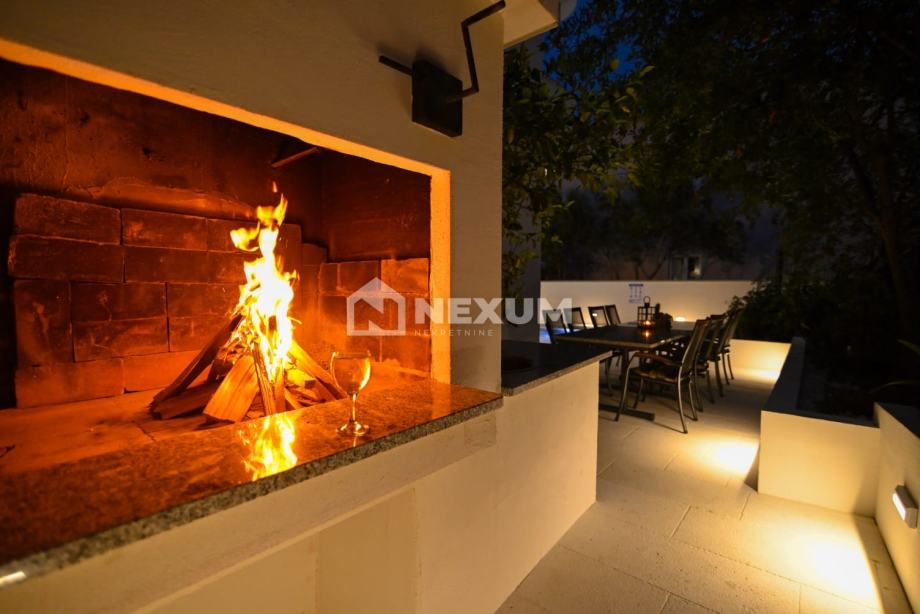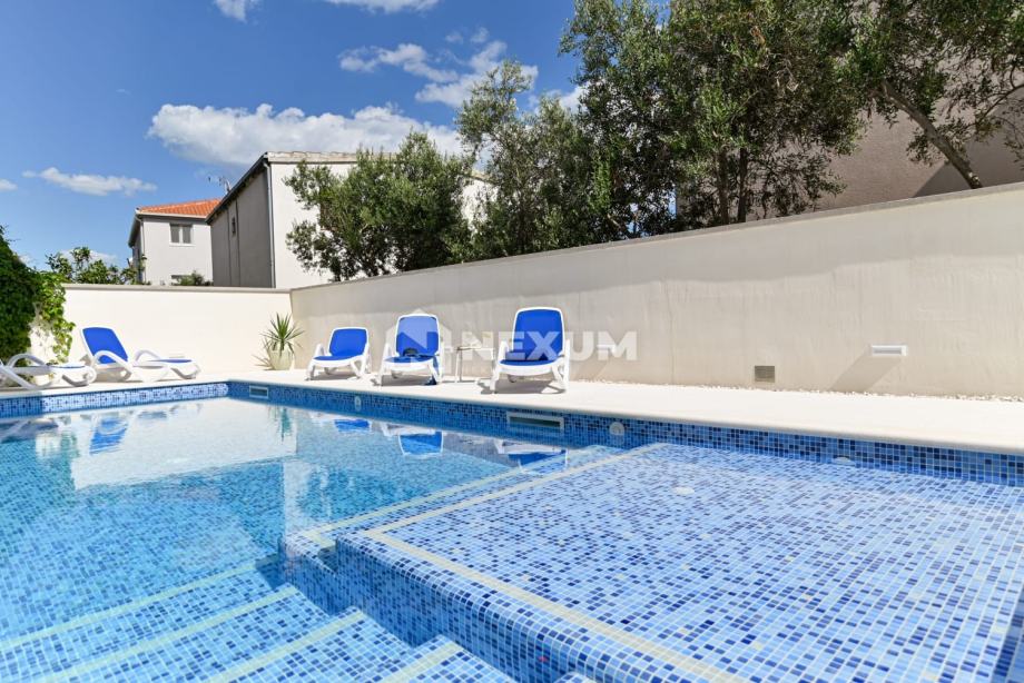Na prodaju je veliki stan s bazenom u prizemlju manje stambene zgrade u Okrugu Gornjem, s pripadajućim velikom terasom s bazenom, konobom u podrumu i dva parking mjesta.