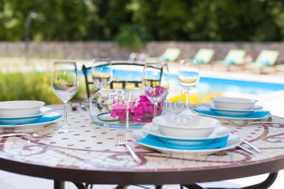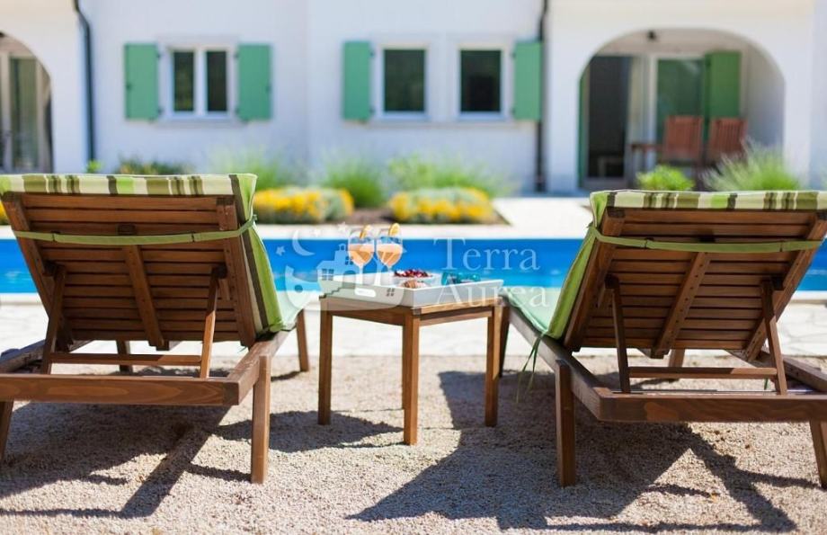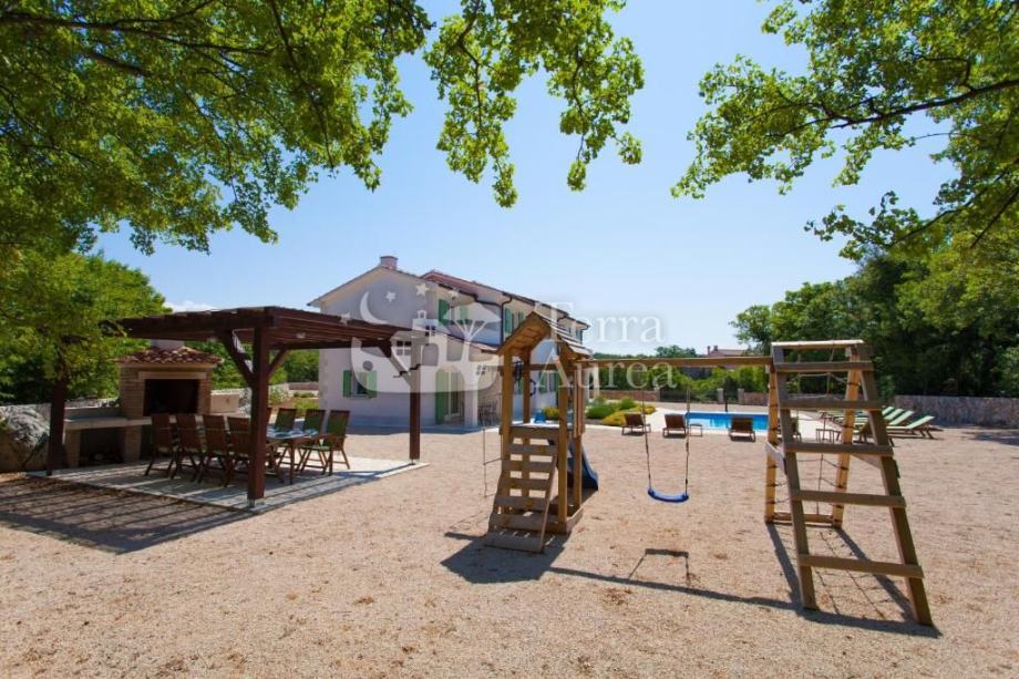 Okućnica je pažljivo uređena i nudi zajednički bazen sa sunčalištem, vanjski tuš, roštilj, prostor za druženje, dječje igralište te parkiralište za više vozila.