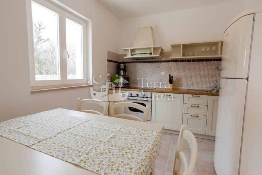 Prizemlje obuhvaća moderno opremljenu kuhinju s blagovaonicom, dnevni boravak s kaminom koji u zimskim mjesecima daje posebnu čar, kupaonicu te prizemlje ima izlaz na terasu na kojoj svakodnevno možete uživati.