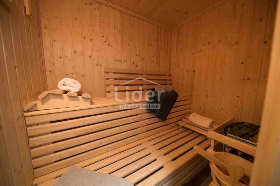 U neposrednoj blizini bazena je sauna, tuš te odvlaživači zraka. U bazenu je postavljen sustav pročišćavanja vode pomoću elektrolize (soli). Bazen je povezan s kućom, ali također i sa stražnjim dvorištem putem klizne staklene stijene.