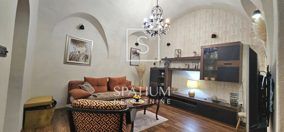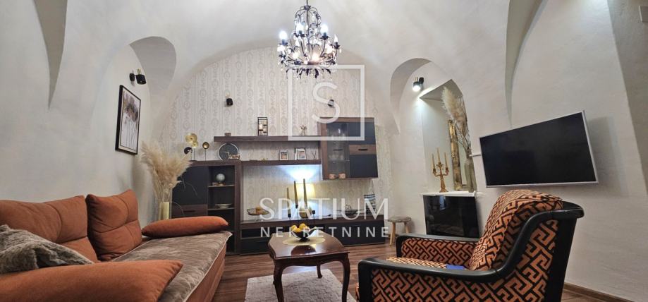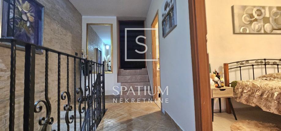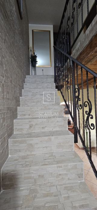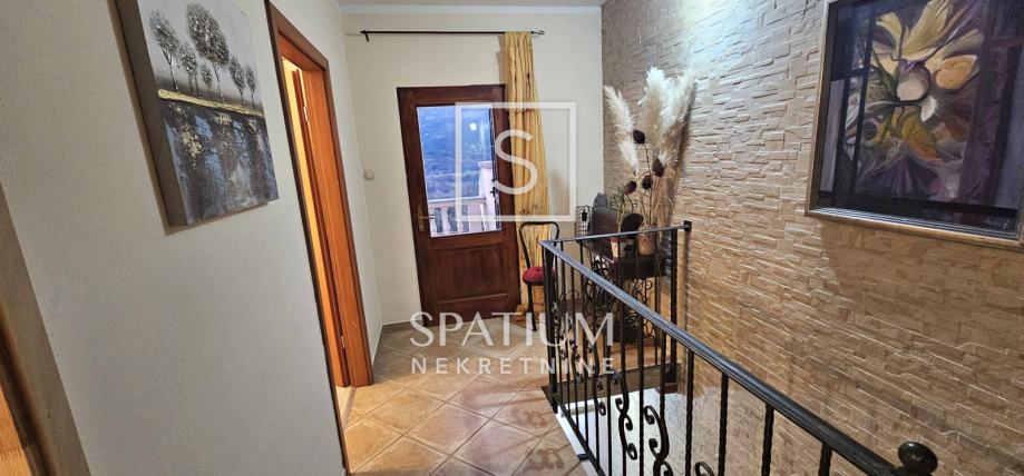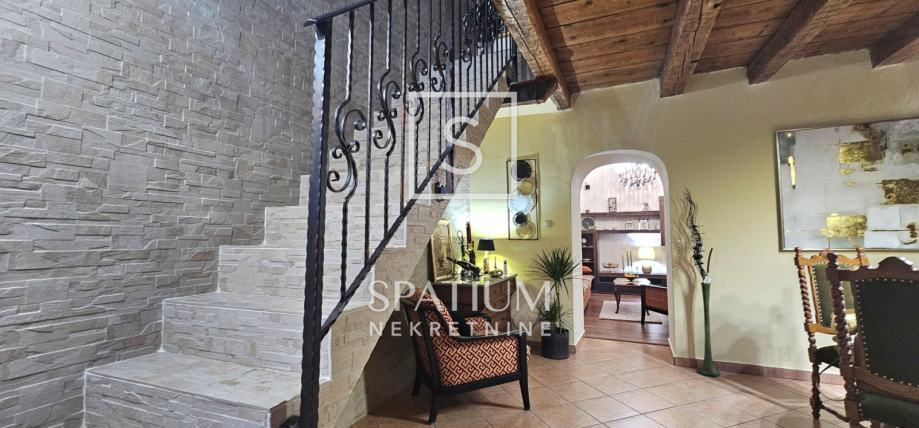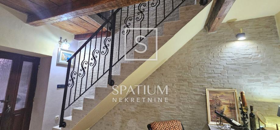 1.kat: kuhinja s blagovaonom i dnevni boravak, stepenice s kovanom ogradom koje vode na drugi kat na kojem se nalaze dvije spavaće sobe,