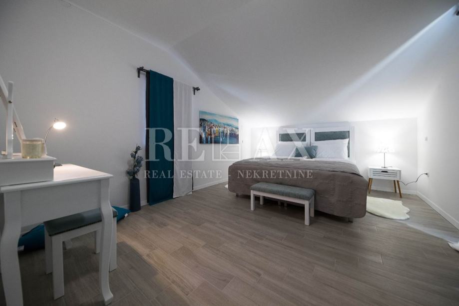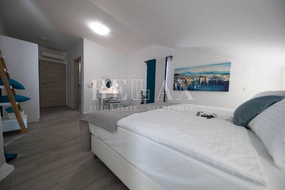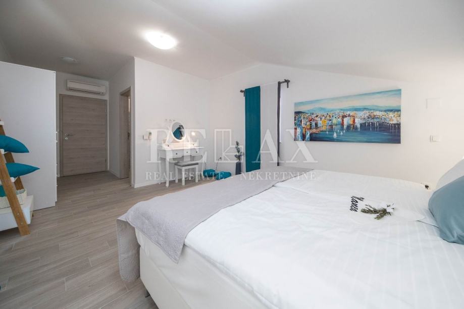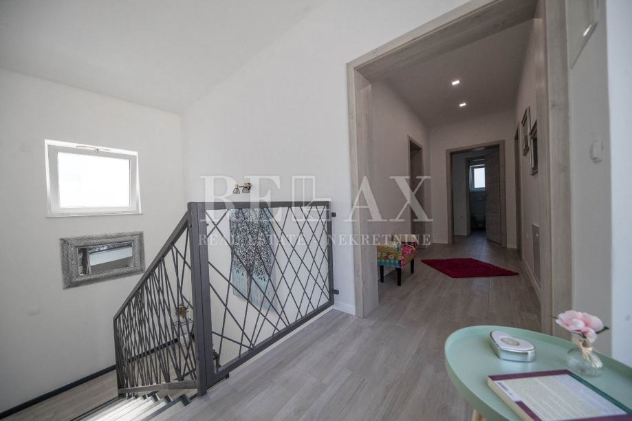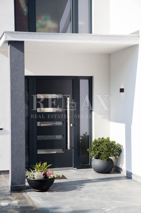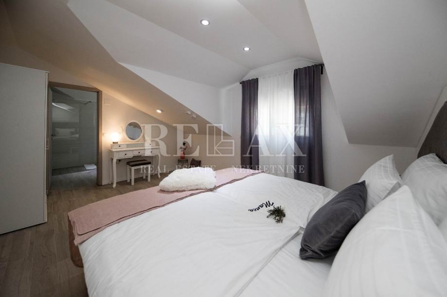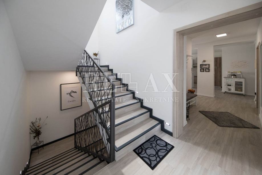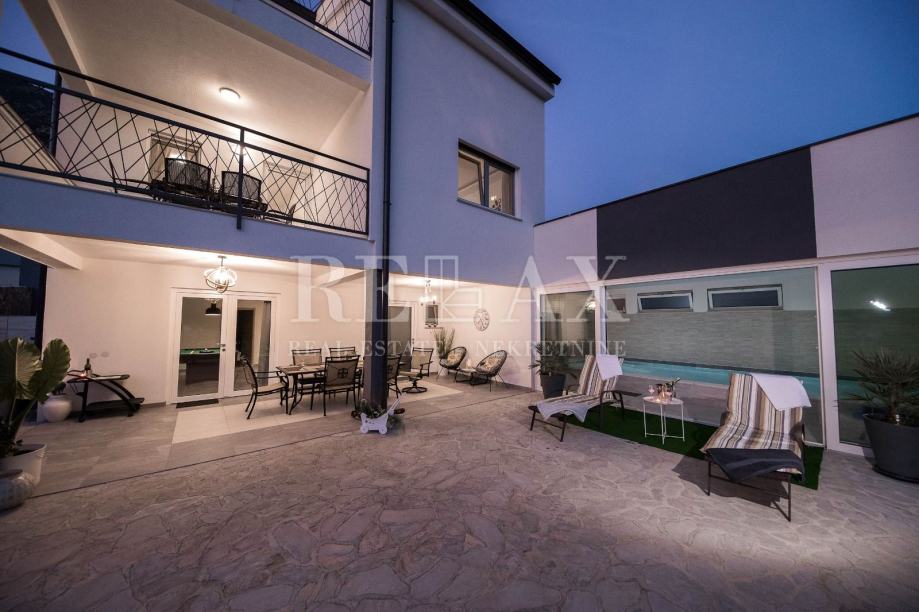 Vila se prostire na više etaža i sastoji se od četiri prostrane spavaće sobe, svaka sa svojom kupaonicom, dodatna dva WC-a, moderno opremljene kuhinje s blagovaonicom te velikog dnevnog boravka. Nekretnina uključuje i dva balkona, prostranu terasu, igraonicu, saunu te unutarnji grijani bazen površine 32 m² s dubinom od 135 cm. Bazen se nalazi u suterenu i opremljen je podnim grijanjem, grijanjem zidova te sustavom odvlaživanja zraka, što omogućuje korištenje tijekom cijele godine. U neposrednoj blizini bazena smještena je sauna i tuš, dok se iz igraonice s teretanom izlazi direktno u okućnicu s terasom, sunčalištem i roštiljem.