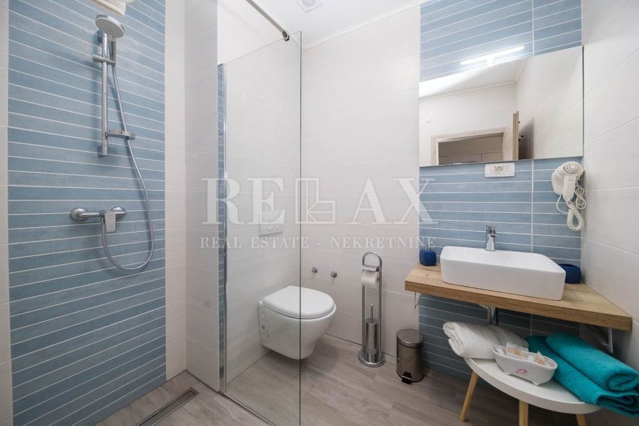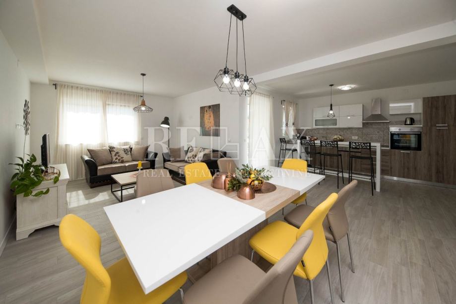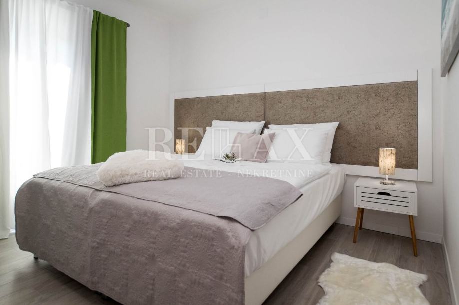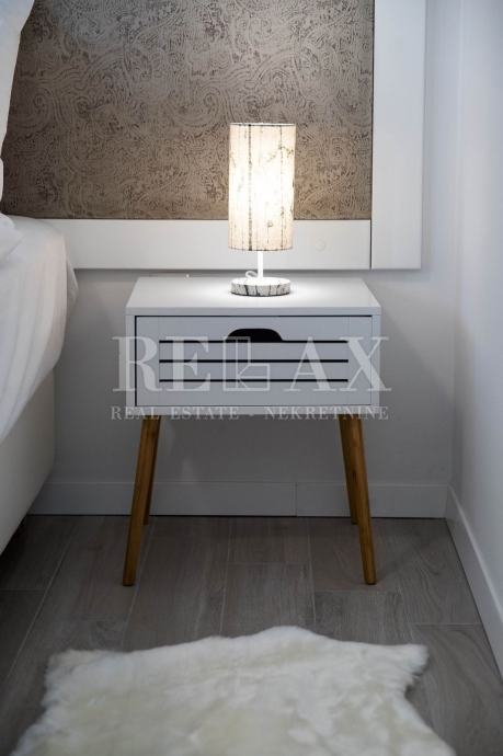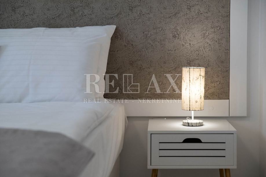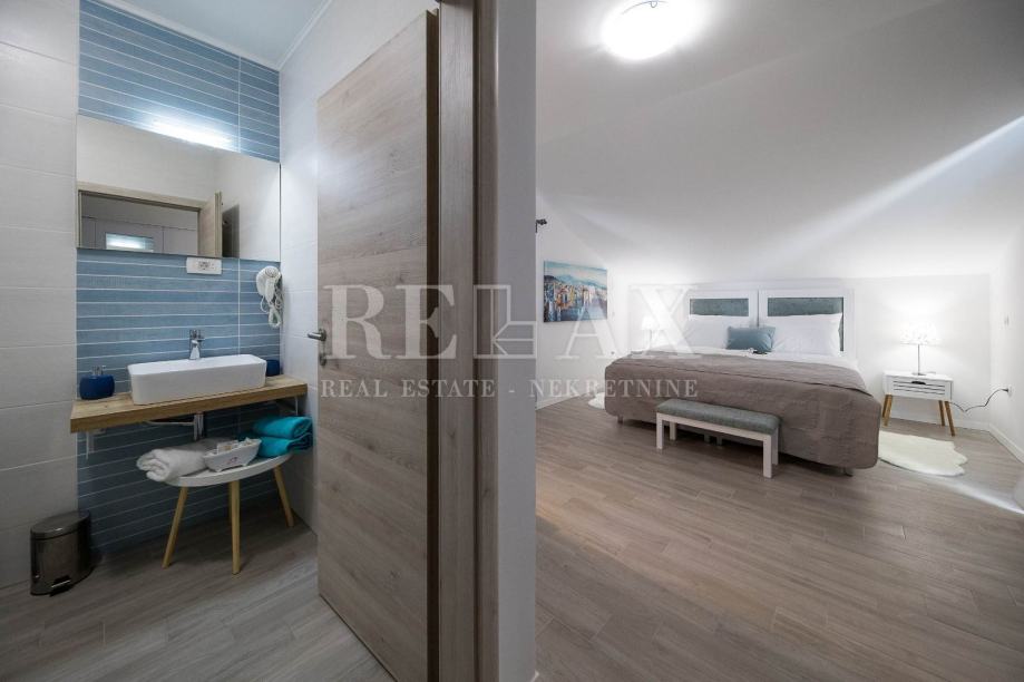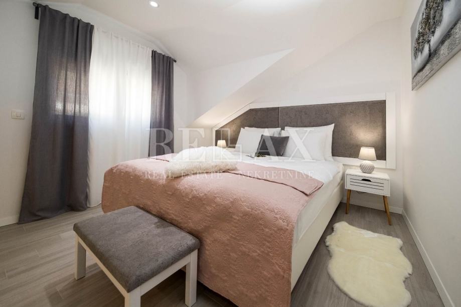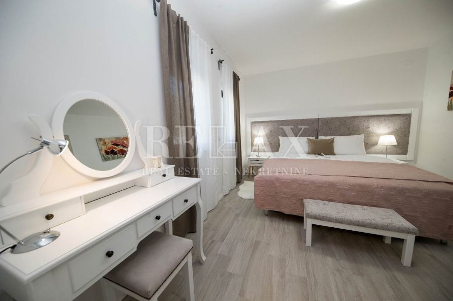 Vila se prostire na više etaža i sastoji se od četiri prostrane spavaće sobe, svaka sa svojom kupaonicom, dodatna dva WC-a, moderno opremljene kuhinje s blagovaonicom te velikog dnevnog boravka. Nekretnina uključuje i dva balkona, prostranu terasu, igraonicu, saunu te unutarnji grijani bazen površine 32 m² s dubinom od 135 cm. Bazen se nalazi u suterenu i opremljen je podnim grijanjem, grijanjem zidova te sustavom odvlaživanja zraka, što omogućuje korištenje tijekom cijele godine. U neposrednoj blizini bazena smještena je sauna i tuš, dok se iz igraonice s teretanom izlazi direktno u okućnicu s terasom, sunčalištem i roštiljem.