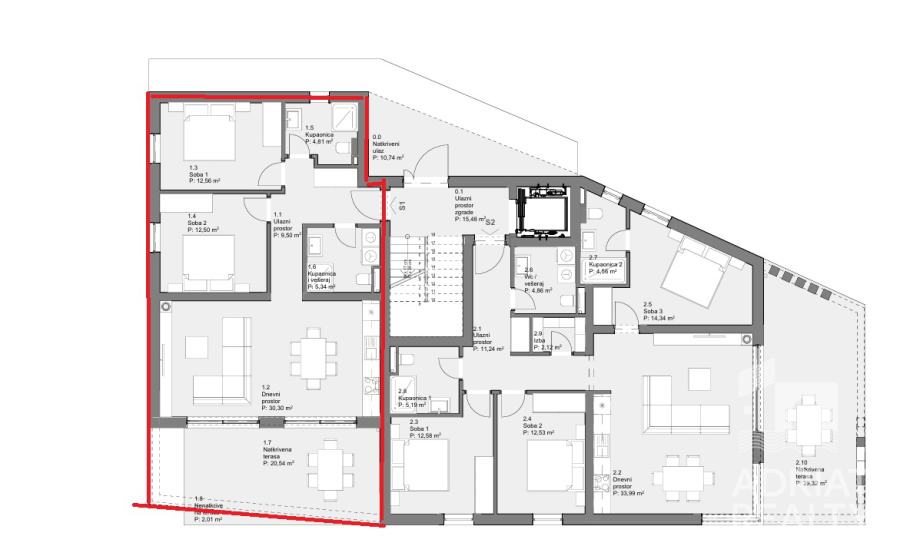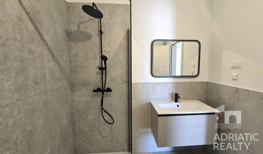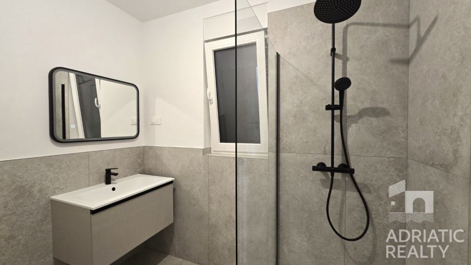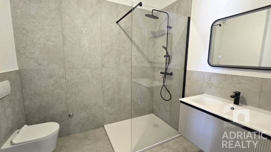 Apartman se sastoji od kuhinje, blagovaonice i dnevnog boravka otvorenog koncepta s izlazom na natkrivenu terasu površine 20,54 m2, koja vodi u vlastiti vrt veličine 40 m2 – savršeno mjesto za opuštanje ili druženje na otvorenom. U ostatku apartmana nalaze se dvije spavaće sobe i dvije kupaonice, od kojih jedna uključuje praonicu rublja.