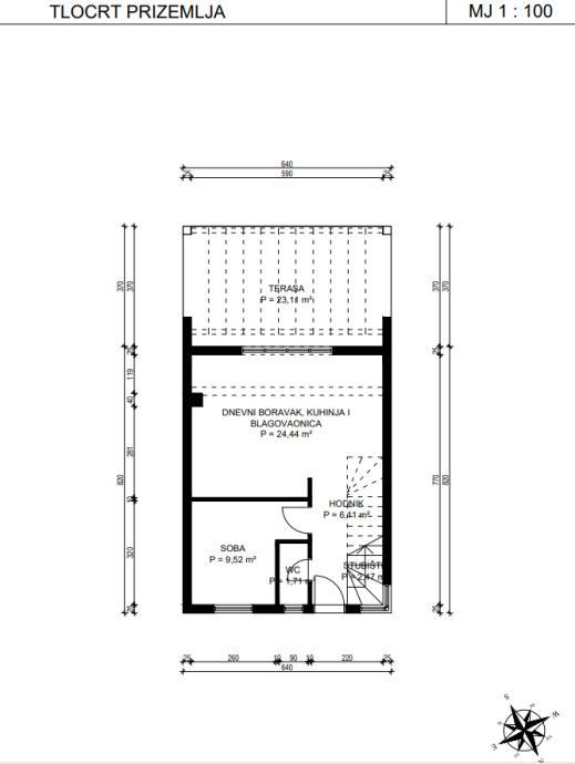 Prizemlje se sastoji od hodnika, stepeništa, sobe, toaleta, kuhinje, blagovaonice sa dnevnim boravkom koji ima izlaz na natkrivenu terasu sa pergolom.