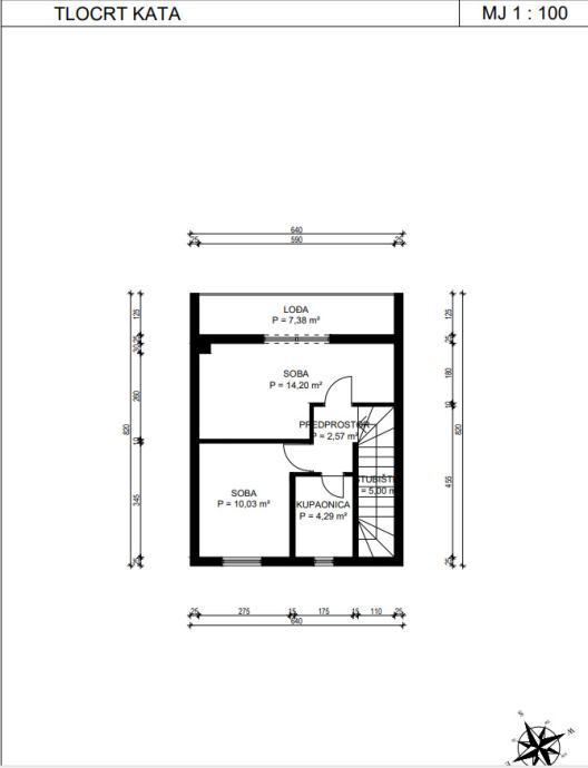 Prvi kat sastoji se od hodnika, dvije spavaće sobe, kupaonice i lođe.
