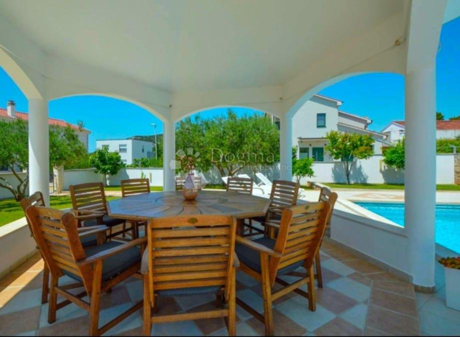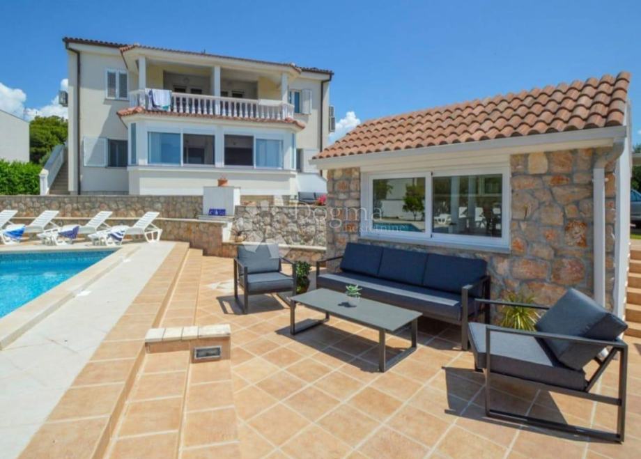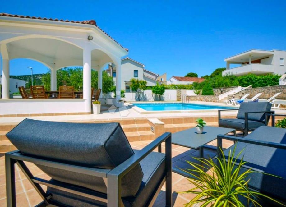 Kuću okružuje prekrasno uređena okućnica s velikim bazenom, natkrivenom sjenicom, ljetnom kuhinjom i roštiljem, stvarajući savršeno mjesto za opuštanje i uživanje u mediteranskom ambijentu.