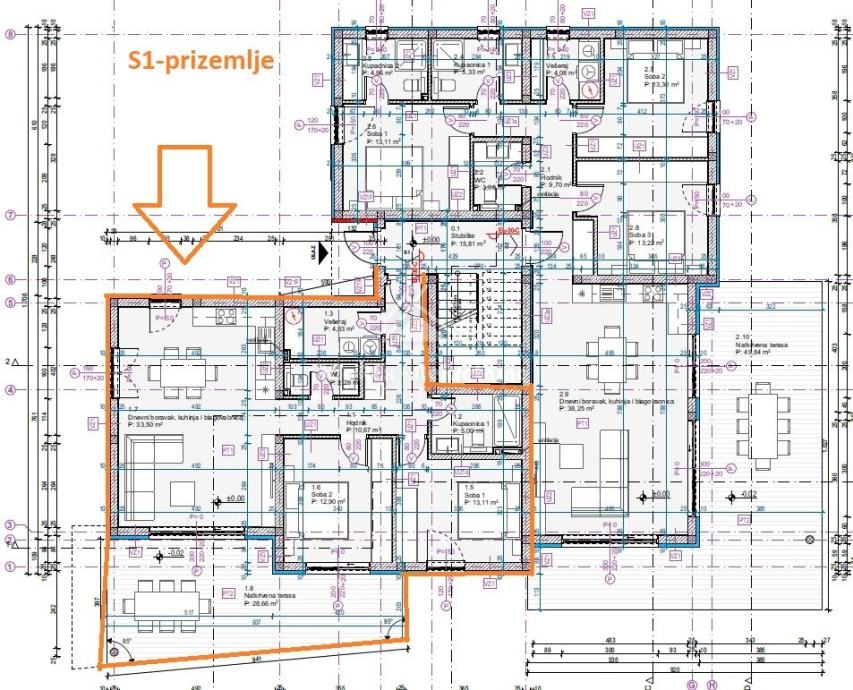 Stan S1- dvosoban stan u prizemlju stambene zgrade neto površine 113 m/2. Stan se sastoji od ulaznog pretprostora, dvije spavaće sobe, kupaonice, praonice , WC-a te velikog dnevnog boravka iz kojeg se izlazi na natkrivenu terasu površine 28.66 m/2. Stanu pripada i vrt površine 120 m/2 i jedno parkirno mjesto.