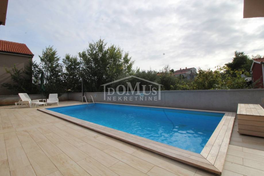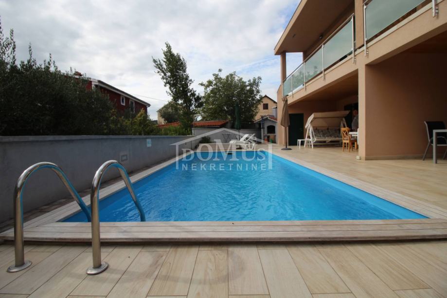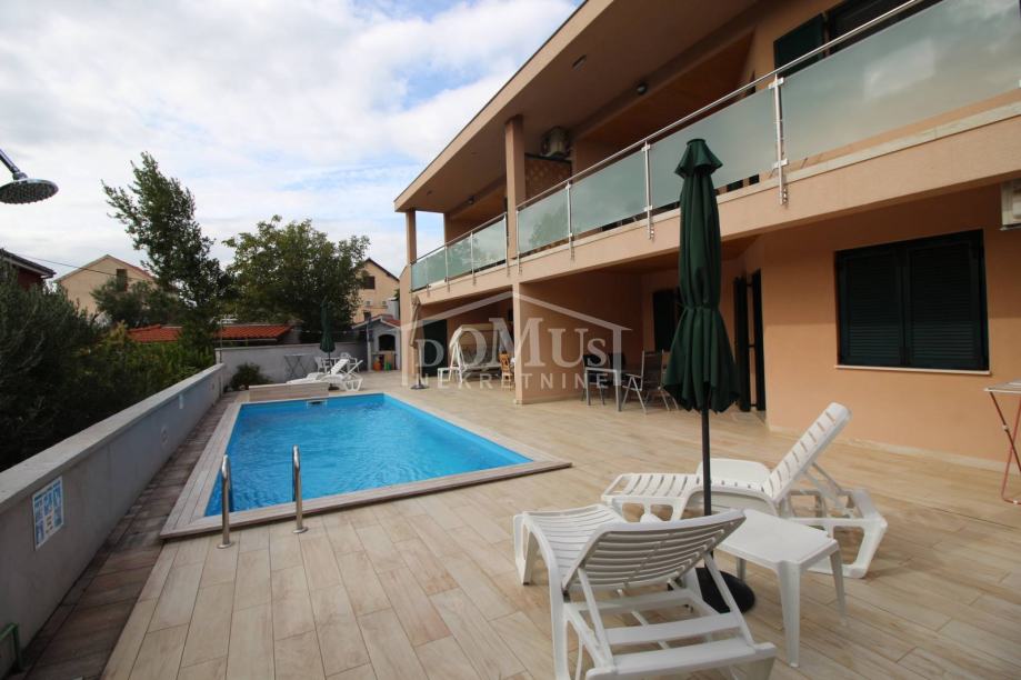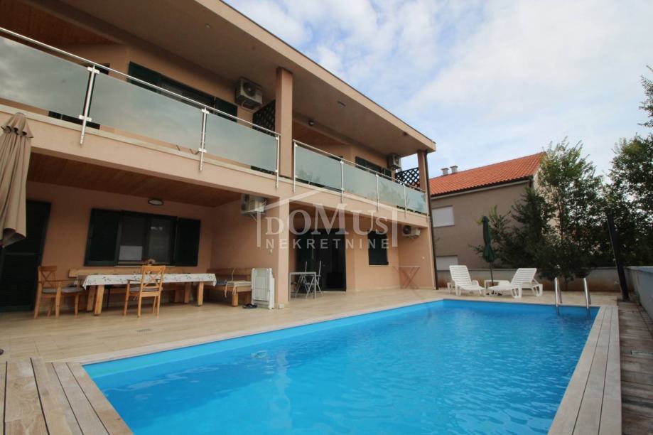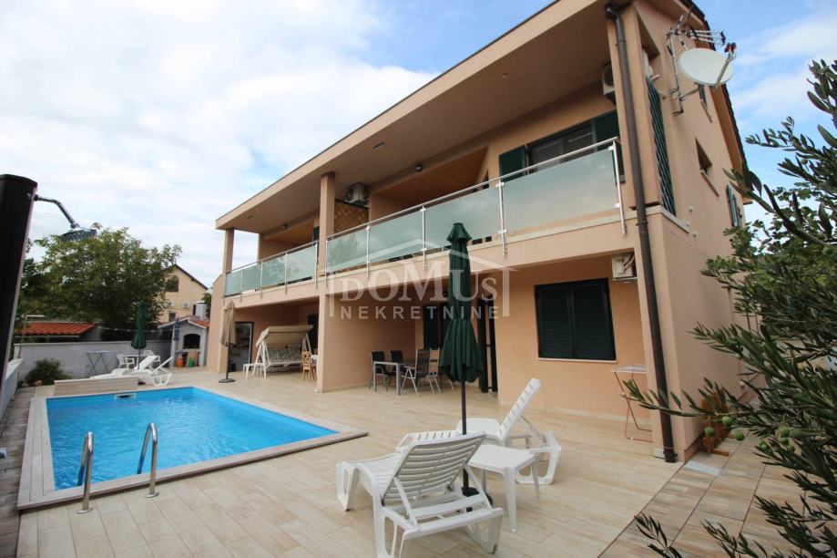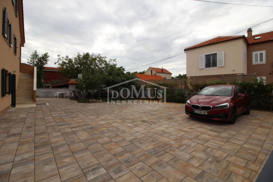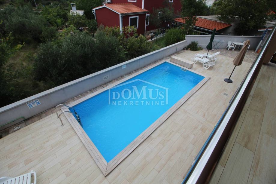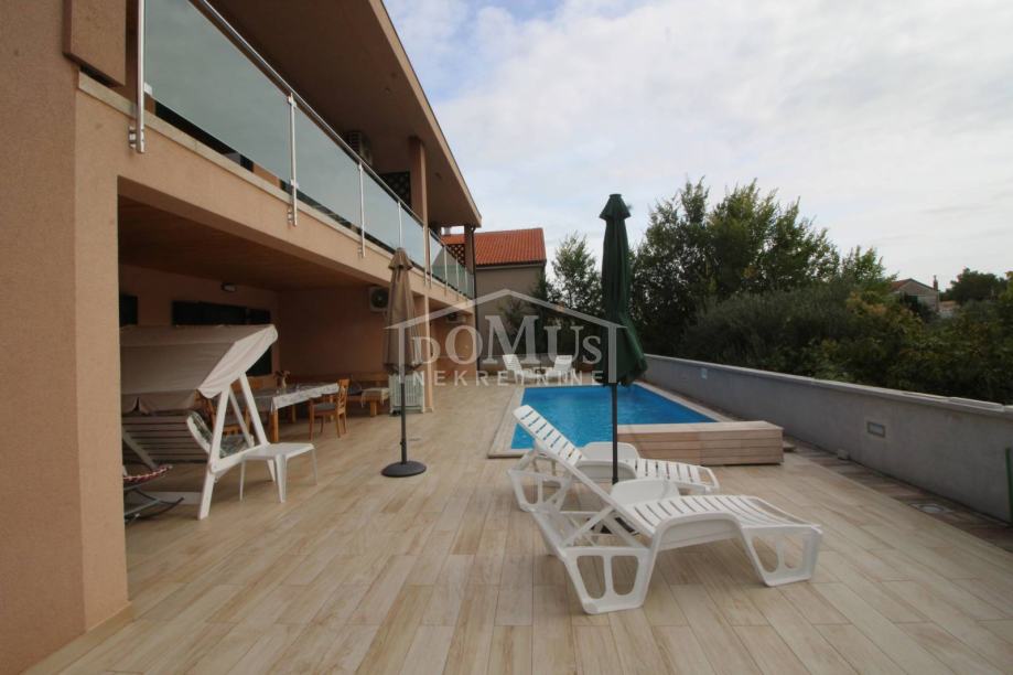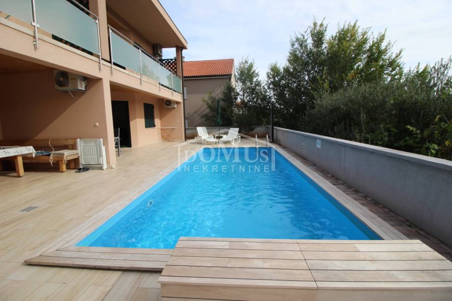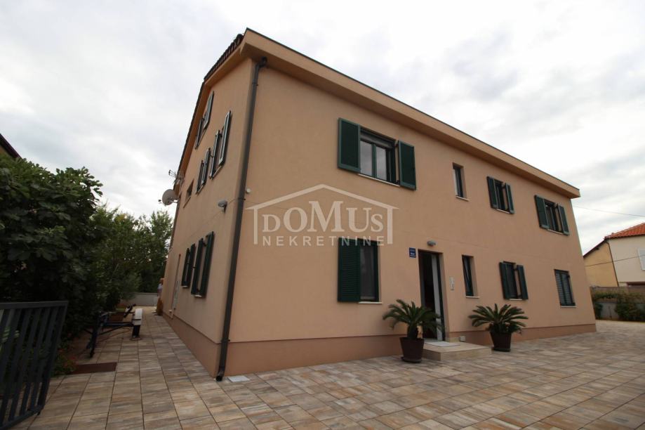 Novogradnja u mirnom okruženju, katnica sa ukupno 453,30m2 stambene površine sa 4 stambene jedinice. U podrumu se nalaze dvije ostave. Glavni ulaz za prizemlje gdje se nalaze hodnik, unutarnje stubište te dvosoban uređen S1 apartman sa lođom od 25,26m2 i jednosoban S2 apartman sa lođom od 13,20m2. Oba apartmana imaju izlaz kroz lođu na uređeno dvorište i bazen (7,80m x 3,35m). Unutarnje stubište vodi na 1. kat gdje se nalazi S3 dvosoban uređen apartman sa natkrivenom terasom od 17,96m2 i S4 jednosoban uređen apartman sa natkrivenom terasom od 17,34m2. Oba apartmana imaju pogled na bazen. U potkrovlju se nalazi prostor u roh bau fazi, predviđeno za još 2 apartmana. Površina parcele je 674m2. Dvorište je kompletno ograđeno i uređeno sa bazenom i roštiljem te parkingom za 4 - 6 auta. Udaljenost do mora je samo 250m, a do centra 800m.