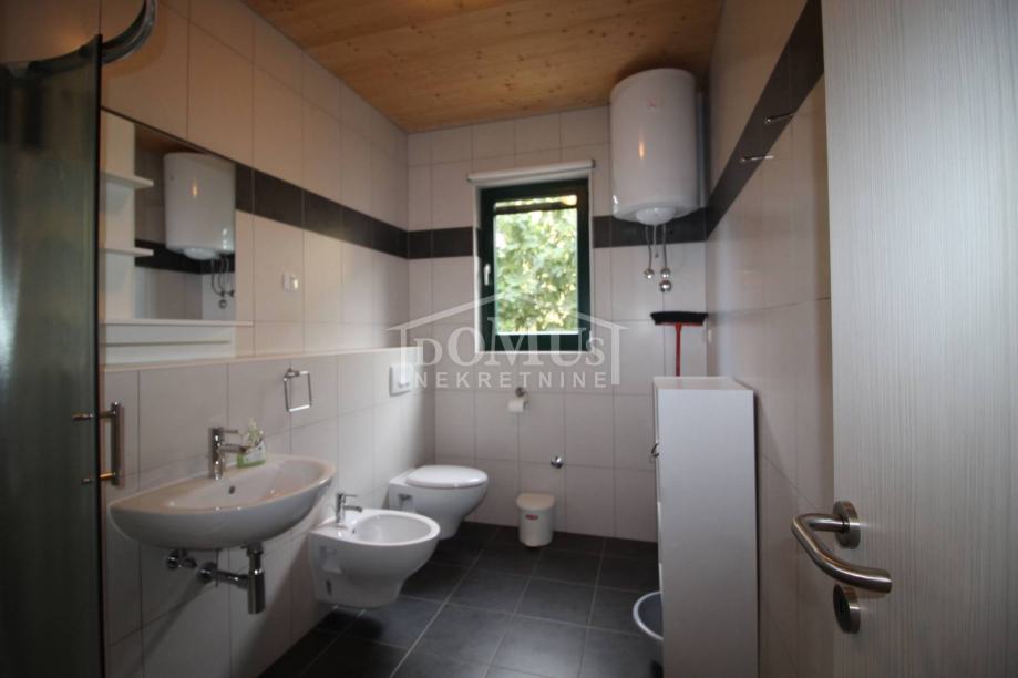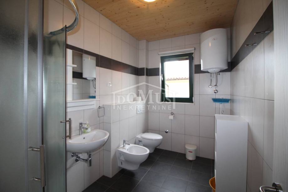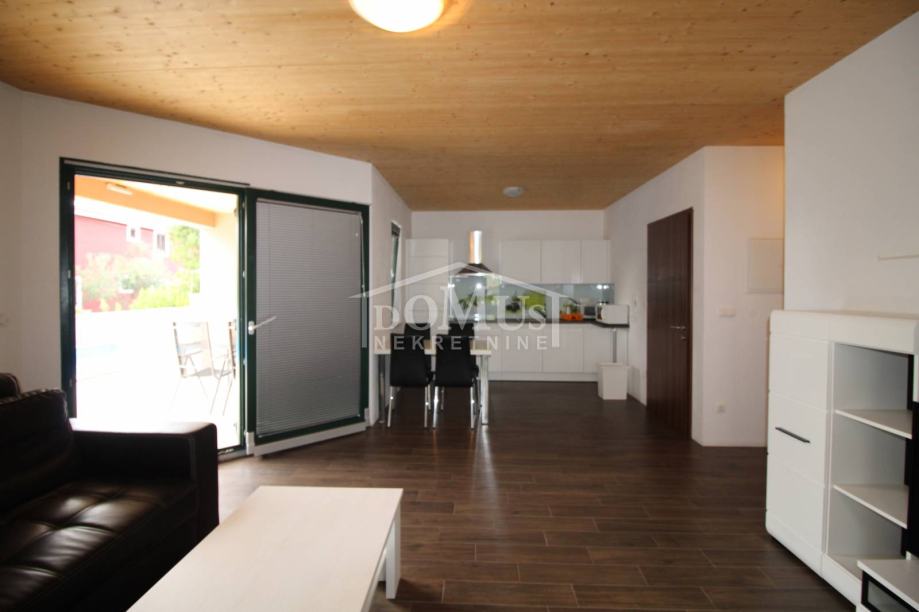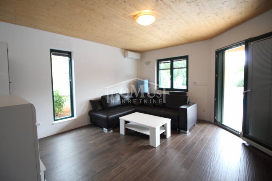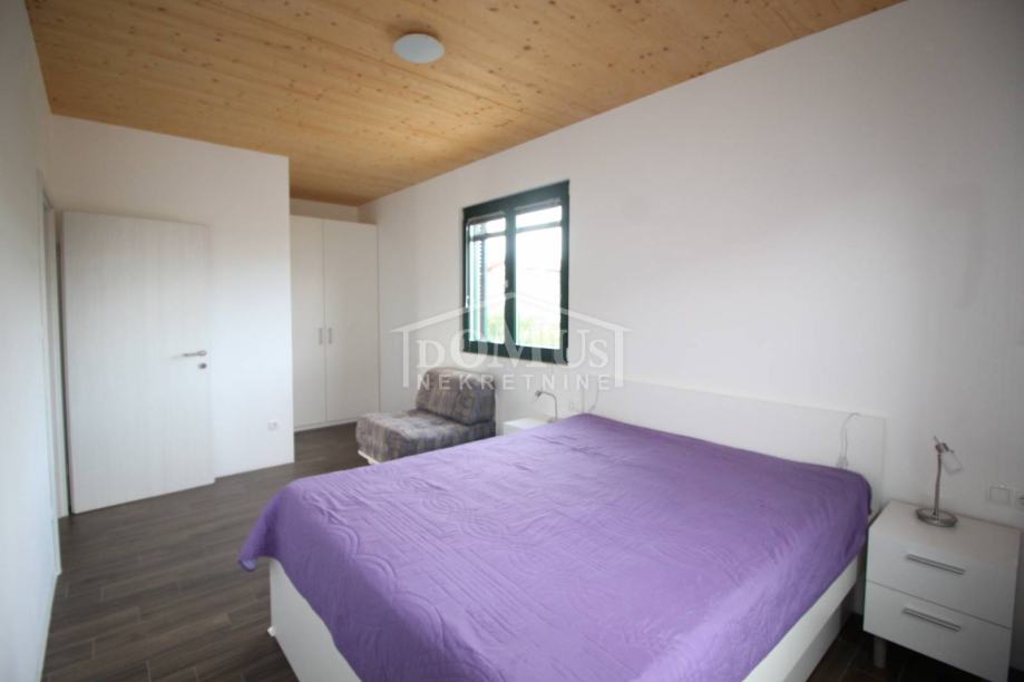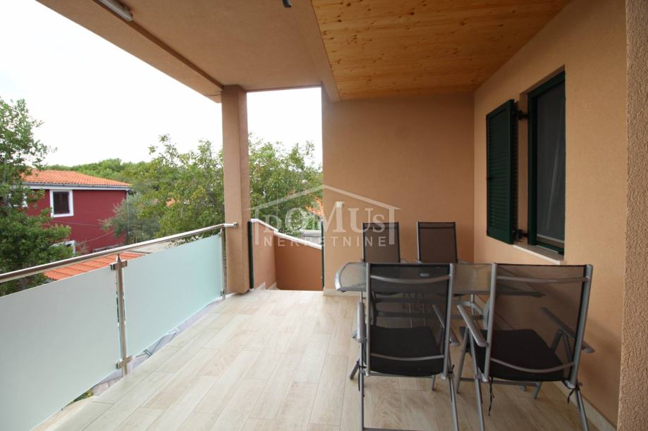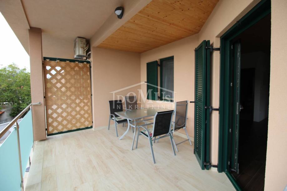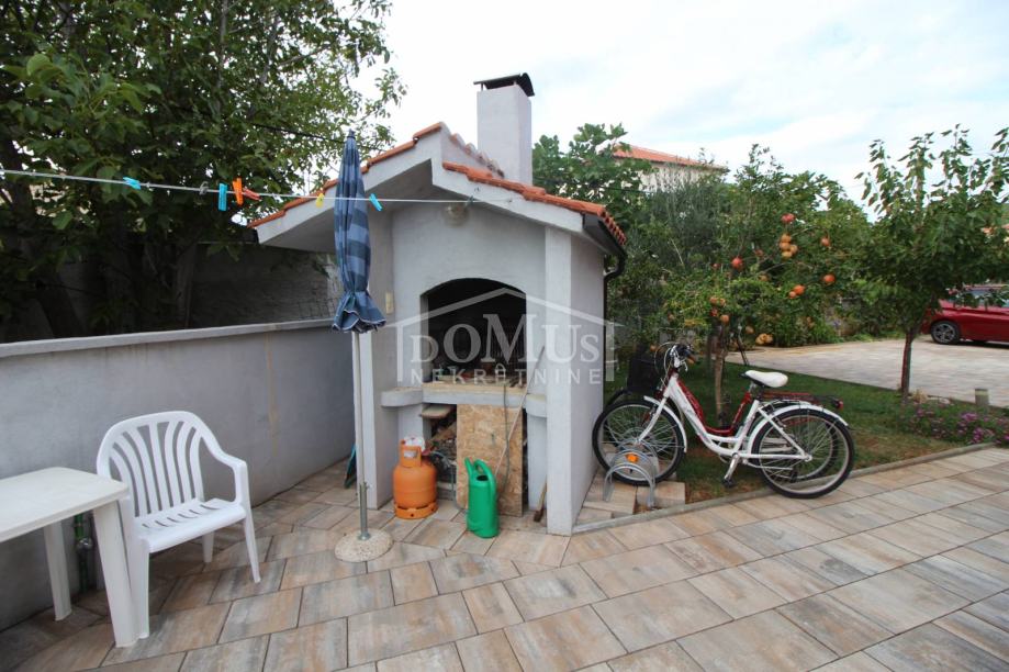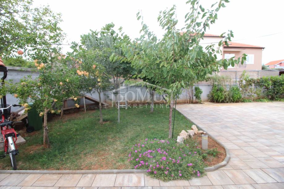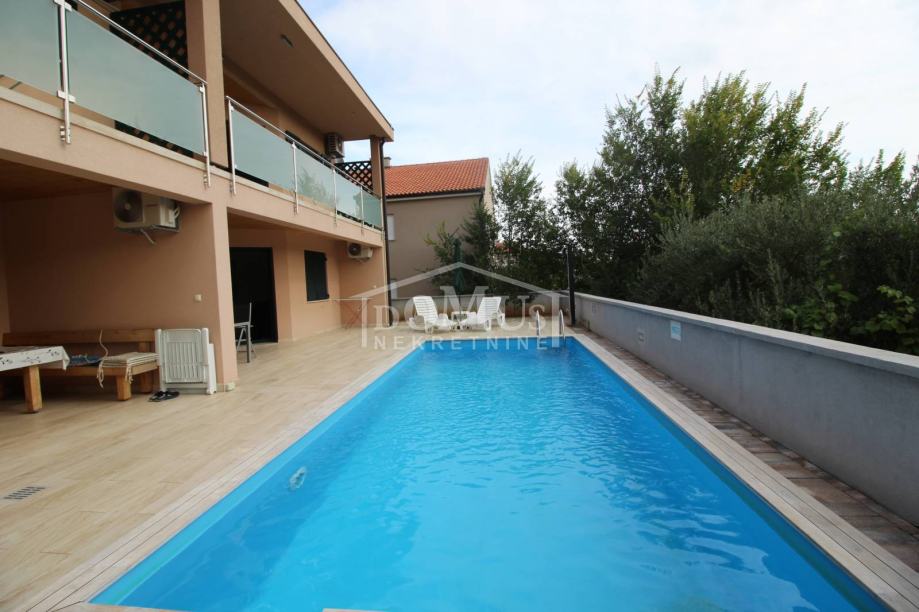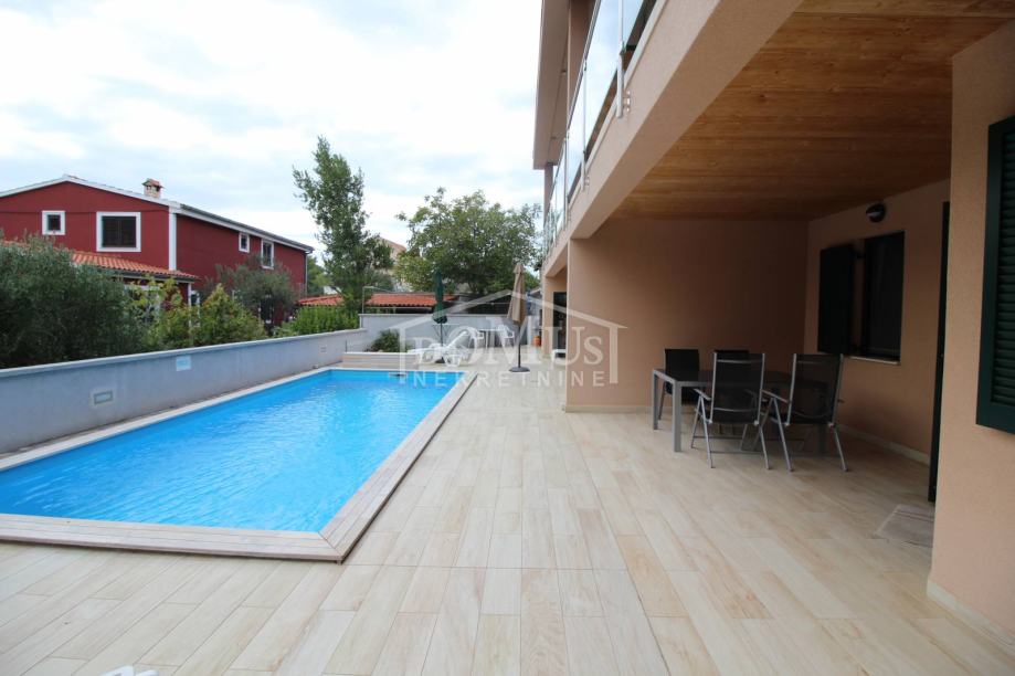 Novogradnja u mirnom okruženju, katnica sa ukupno 453,30m2 stambene površine sa 4 stambene jedinice. U podrumu se nalaze dvije ostave. Glavni ulaz za prizemlje gdje se nalaze hodnik, unutarnje stubište te dvosoban uređen S1 apartman sa lođom od 25,26m2 i jednosoban S2 apartman sa lođom od 13,20m2. Oba apartmana imaju izlaz kroz lođu na uređeno dvorište i bazen (7,80m x 3,35m). Unutarnje stubište vodi na 1. kat gdje se nalazi S3 dvosoban uređen apartman sa natkrivenom terasom od 17,96m2 i S4 jednosoban uređen apartman sa natkrivenom terasom od 17,34m2. Oba apartmana imaju pogled na bazen. U potkrovlju se nalazi prostor u roh bau fazi, predviđeno za još 2 apartmana. Površina parcele je 674m2. Dvorište je kompletno ograđeno i uređeno sa bazenom i roštiljem te parkingom za 4 - 6 auta. Udaljenost do mora je samo 250m, a do centra 800m.