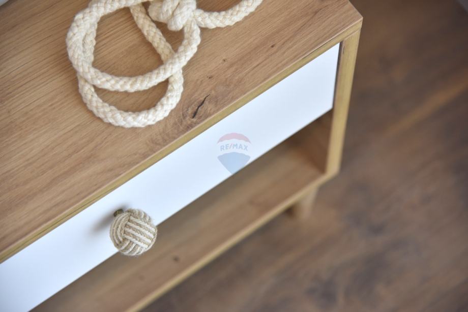 Prizemlje: ulaz sa stubištem, hodnik, wc, spremište, moderna kuhinja s blagovaonicom, te spavaća soba s vlastitom kupaonicom.