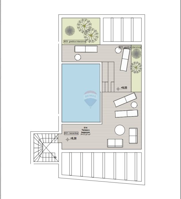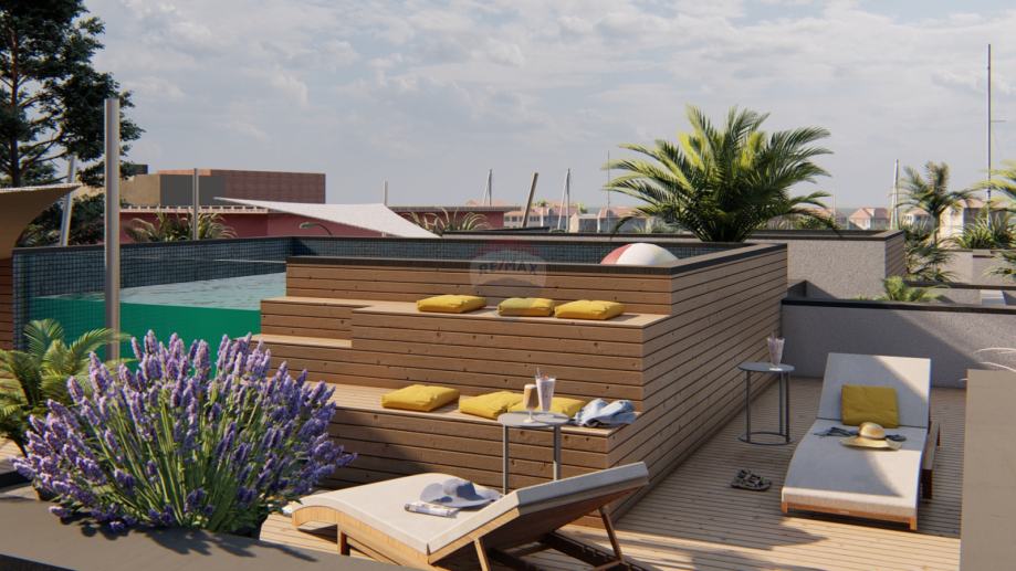Vanjsko stubište vodi na krovnu terasu površine cca 70 m2, na krovnoj terasi postoji priprema za instaliranje dodatnih sadržaja po želji (jacuzzi).