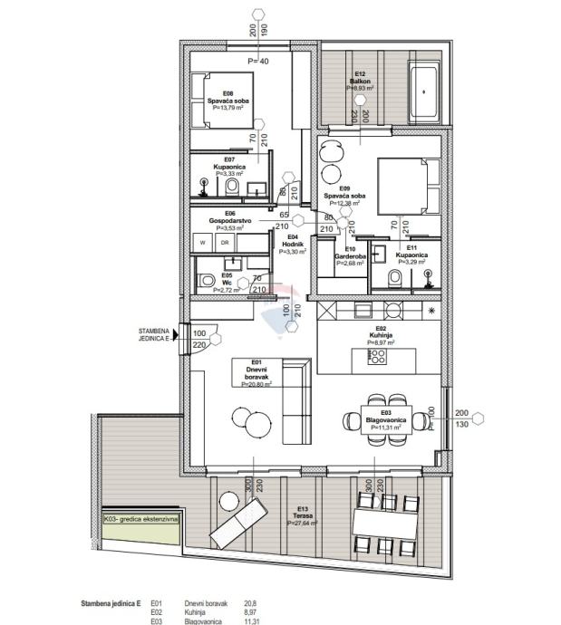 Stanu pripadaju 2 djelomično natkrivene terase veličine 27,64 m2 i 8,93 m2, te 1 parkirno mjesto.